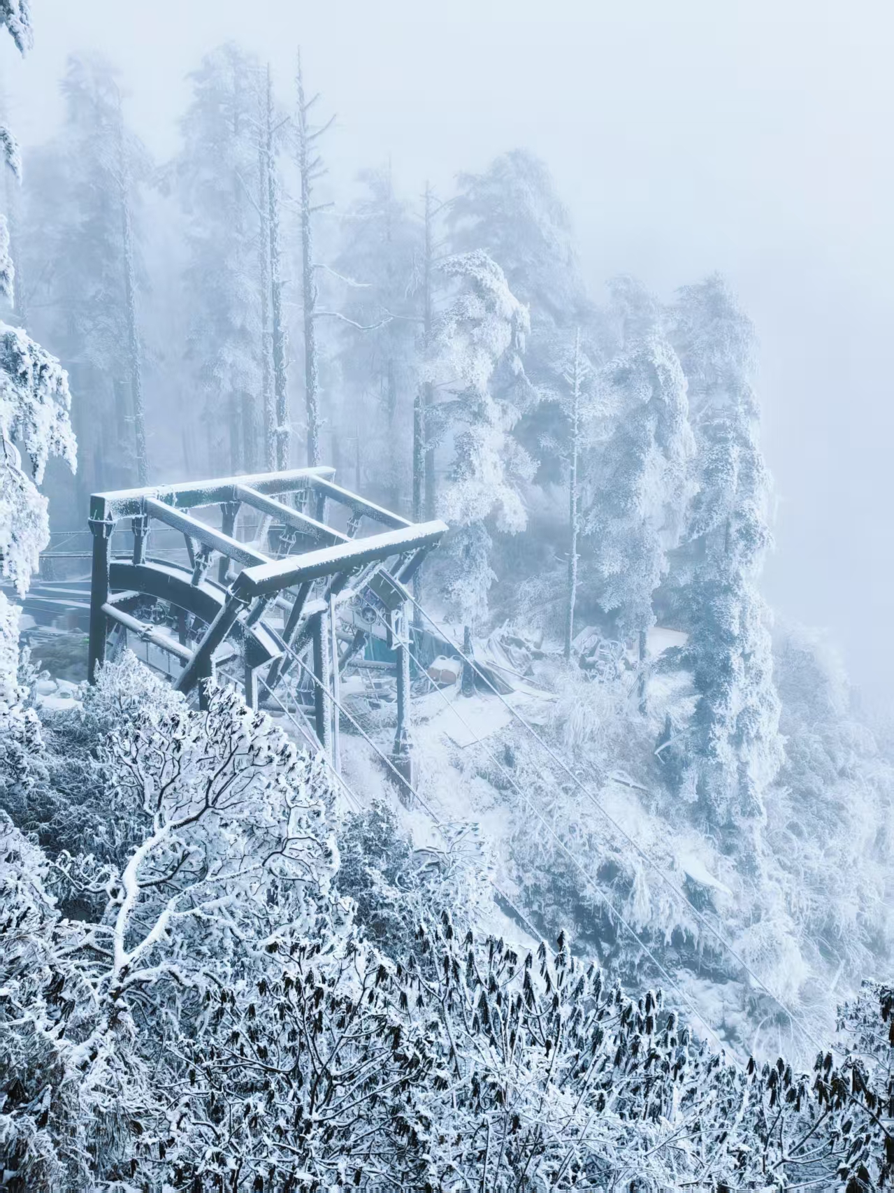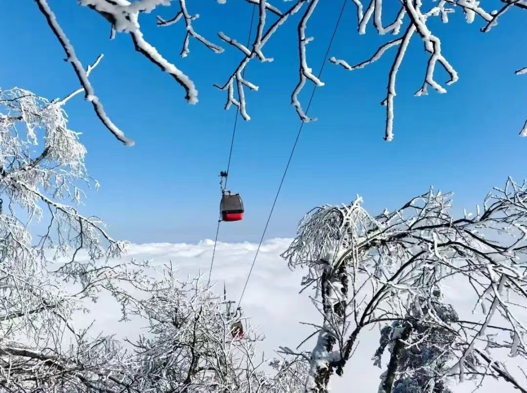 ●从游客中心出发,乘坐金花桥索道、古佛坪索道后到达云顶之巅,路赏雪松雾凇、观贡嘎雪山。