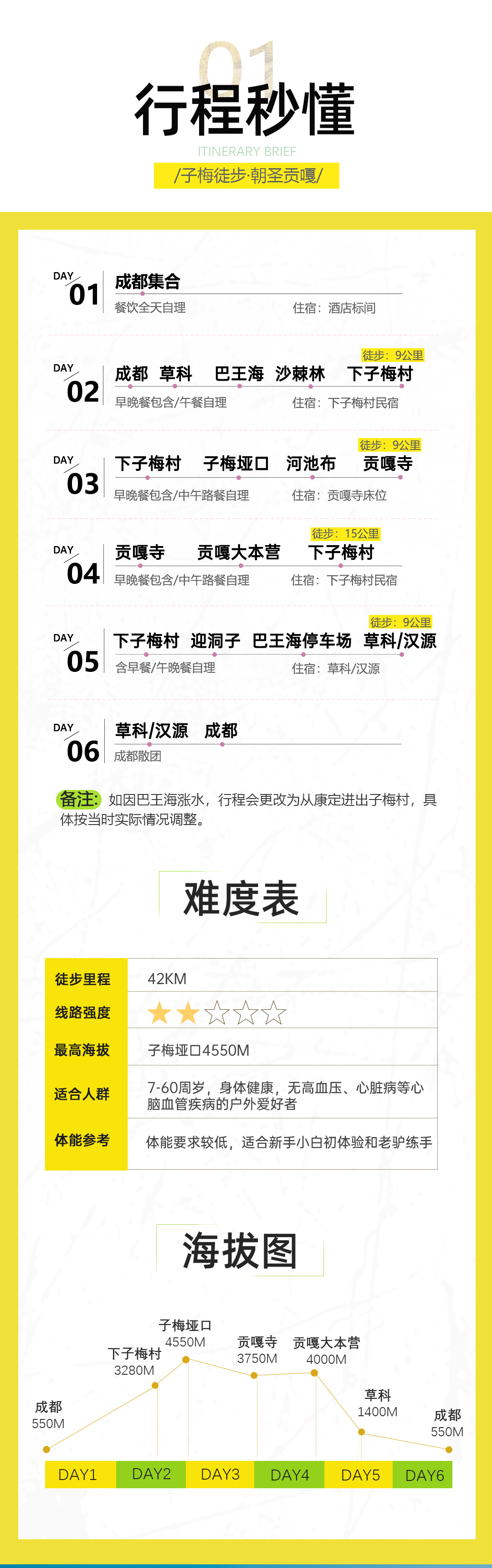 备注:若遇草科--巴望海路段涨水,无法通行,改走康定。具体线路根据实际情况为准。