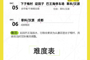 2.餐饮:集合日晚餐,全程午餐、路餐,草科乡/汉源县晚餐自理,驴友可一起AA,向导可以根据需求推荐;
