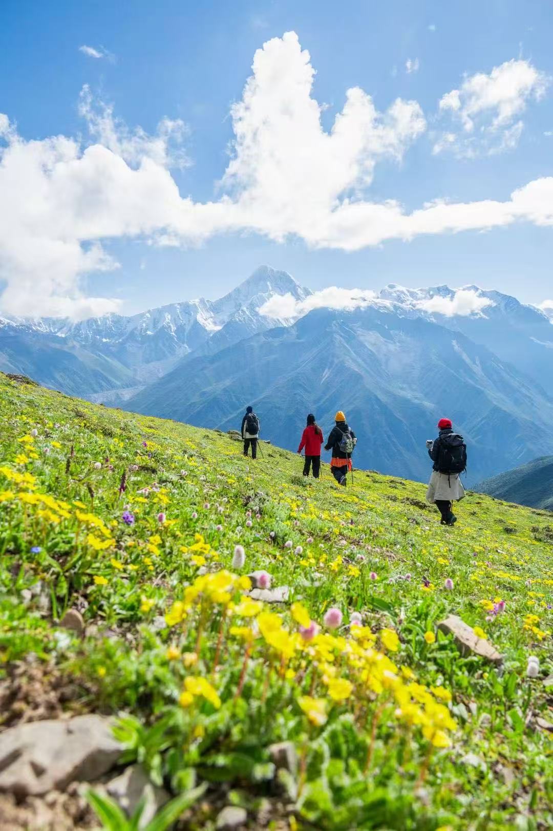 每年5-7月份漫山遍野高山杜鹃,高原野花如炽尽态极妍,映衬圣洁雪山,分外娇艳。徒步于此,恍若世外仙境。上午徒步结束后乘车到达中子梅村,前往贡嘎寺,徒步6公里大约2个半小时到达,为大家准备了桌椅,可以在这里喝一个下午茶,观赏贡嘎雪山日落金山,还有贡嘎雪山的星空,晚餐为大家煮火锅。
