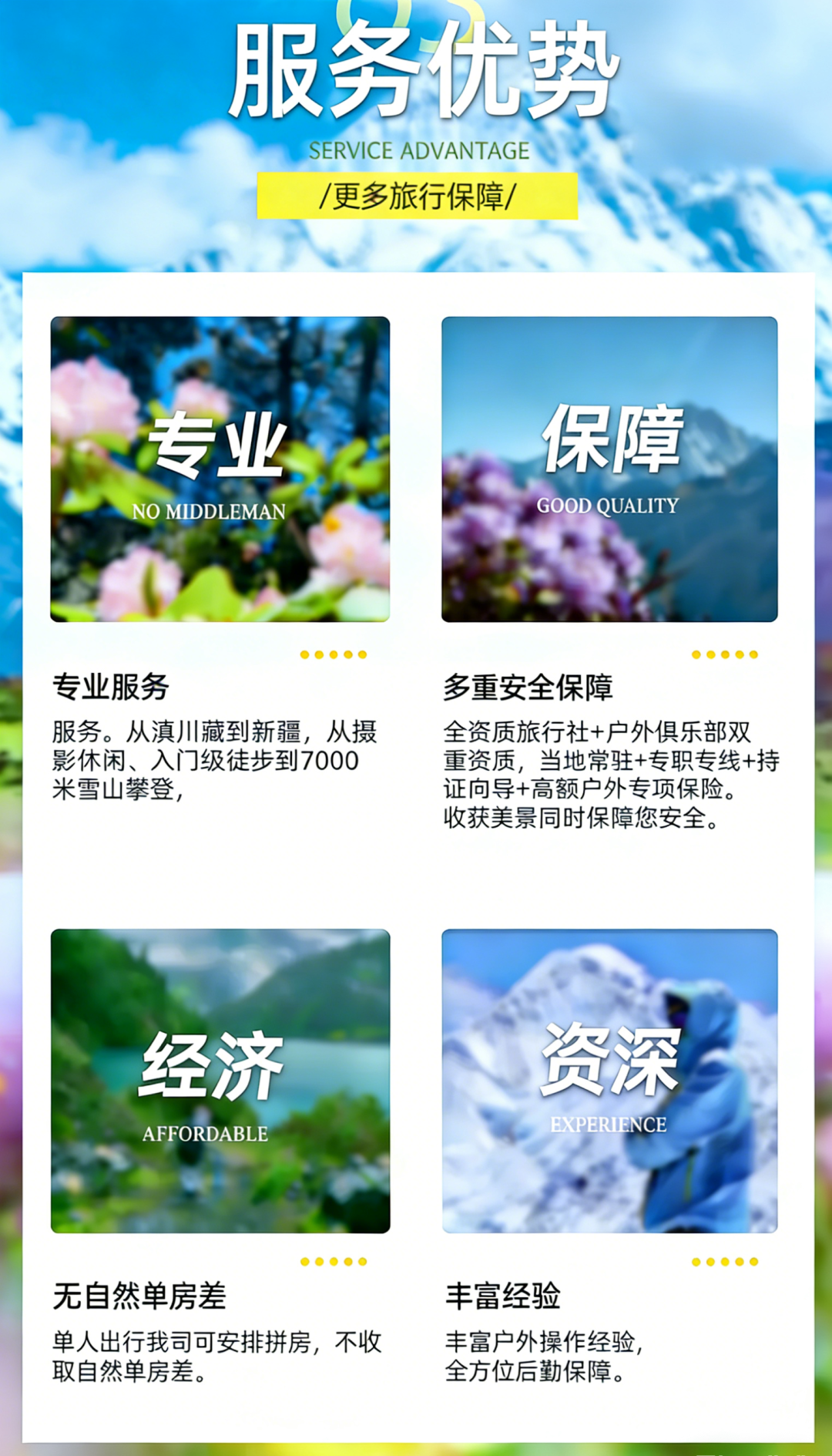 4.单房差:不收取自然单房差。我司按照报名顺序拼房,如最后没有同团的驴友一起拼房,我们则可能安排向导或其他团的同性客人拼房,未补单房差则默认为同意我司这样安排;若需酒店单住补对应房差;