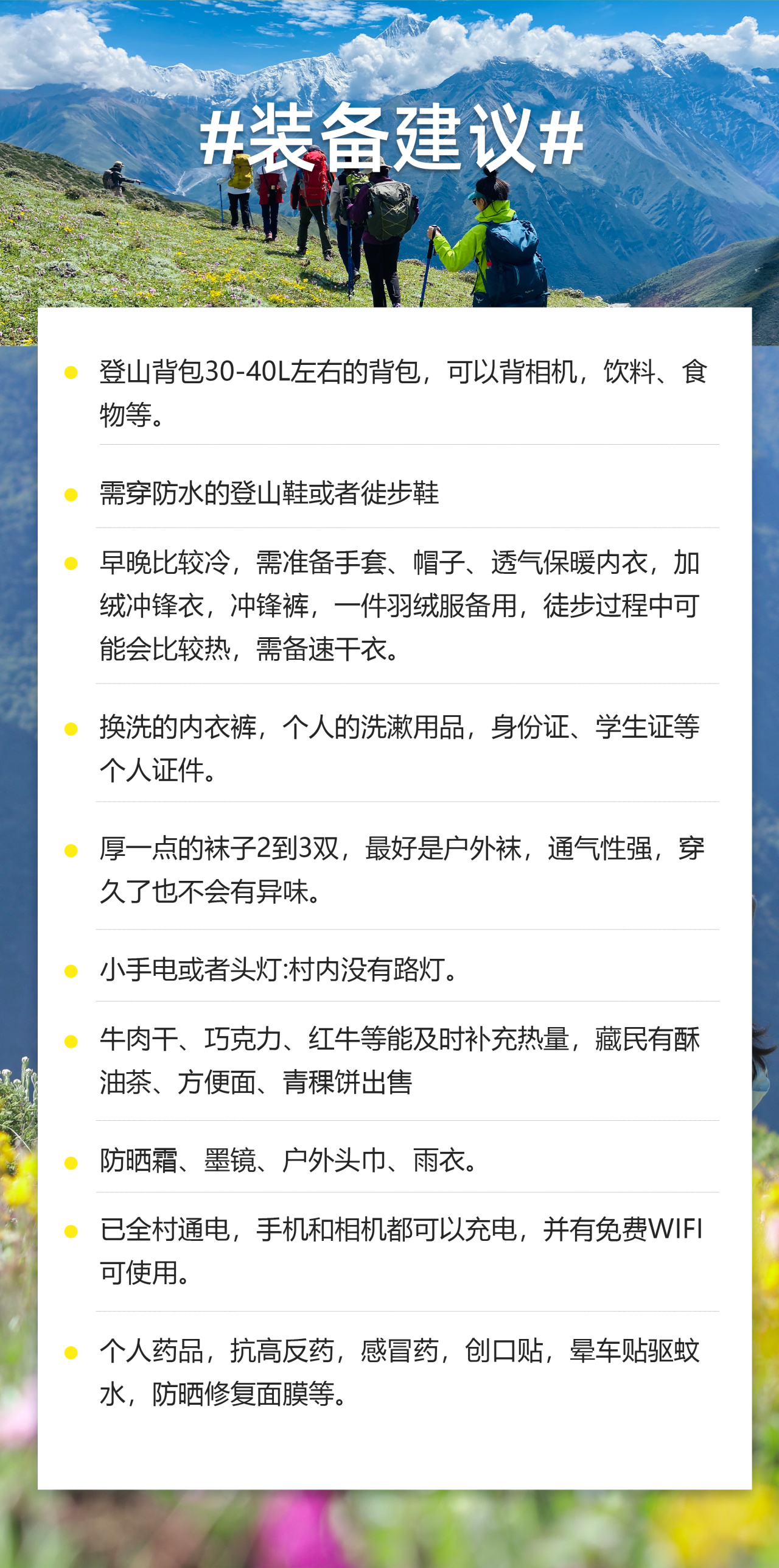▲ 适宜人群:本产品以高原徒步为主,适合18-55岁、有徒步经验人群。55周岁以上者,如有一定经验可咨询客服。