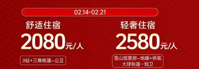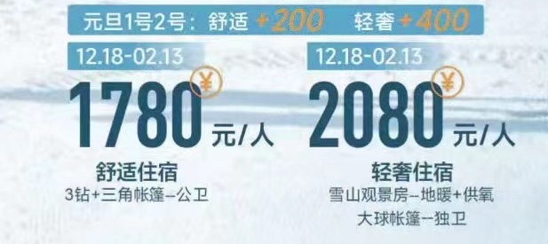 2、升级轻奢住宿标准(雪山观景|地暖+供氧、大球帐篷)+300元/人,春节+500/人