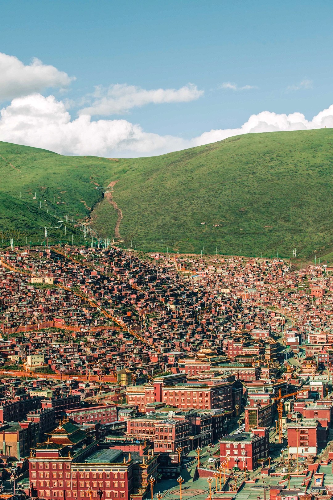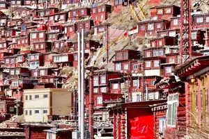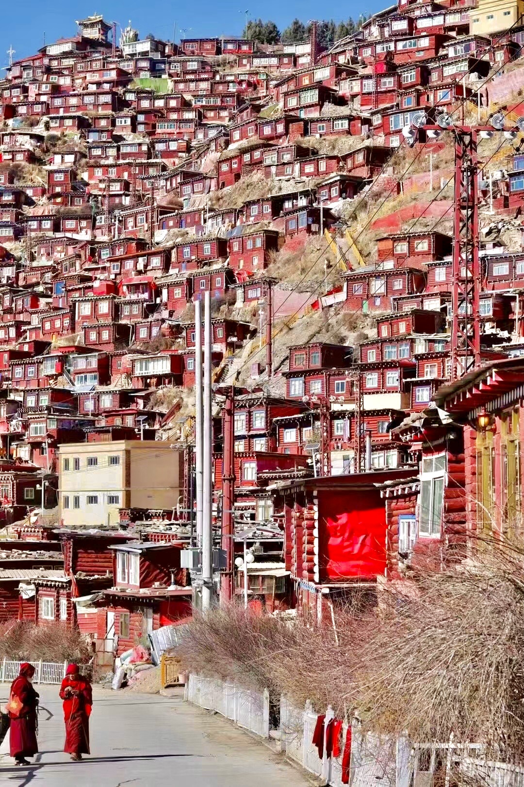 在佛学院周围的山坡上,布满了密密麻麻的红色木房子,形成了令人震撼的色达山河一片红。