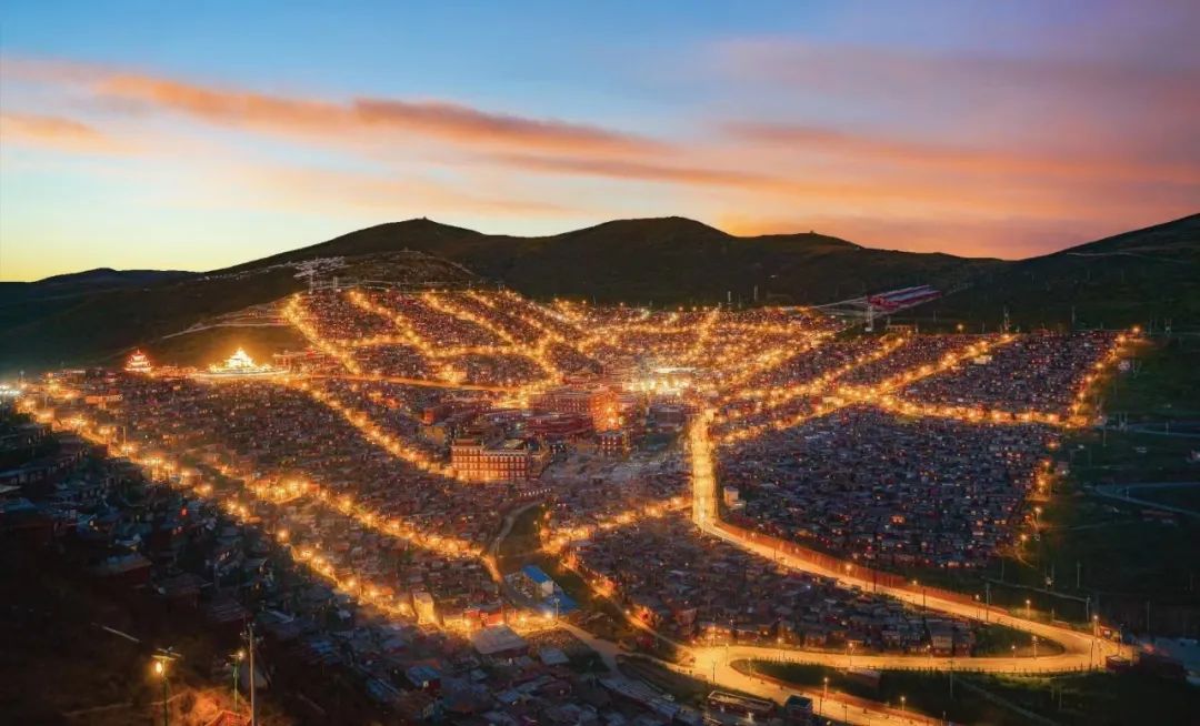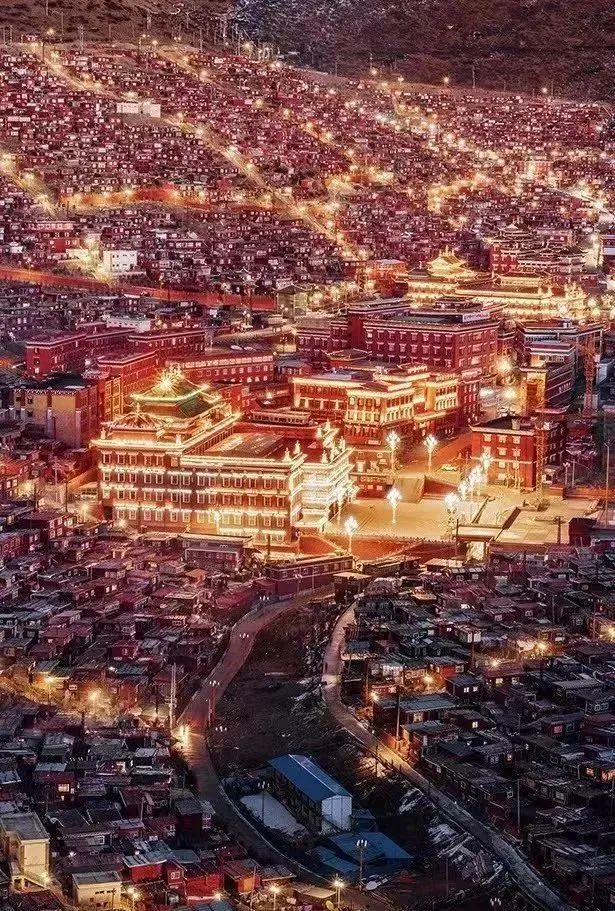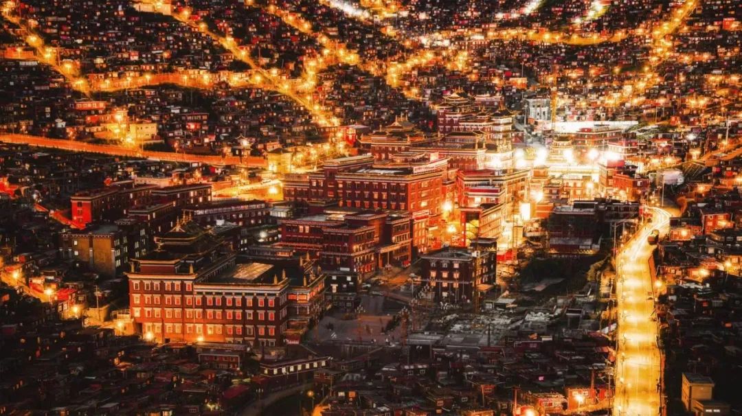 覆盖在山坡上的一间间僧舍,化作点点微光,如众星拱月一般簇拥着山坡上的坛城,似环绕,也似追随。