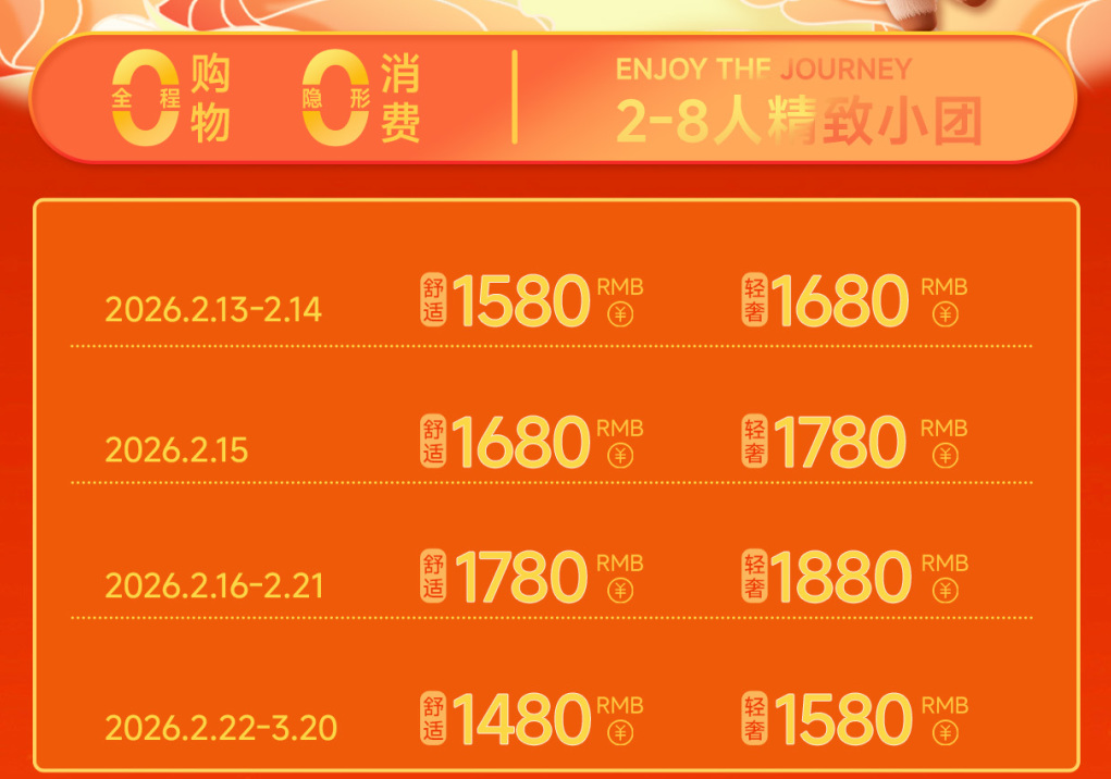1、价格默认春节团期舒适型标间费用,其他团期费用参考小程序报价
