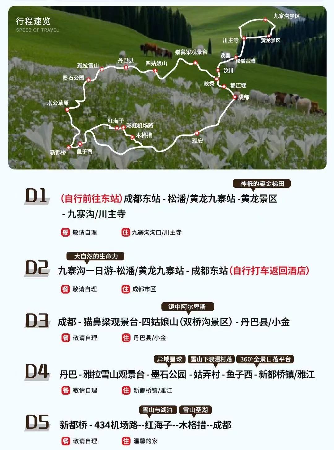 第5天约正常情况散团时间晚上七八点左右,如遇交通管制/堵车/旅游旺季等特殊情况,回到成都的时间较晚,建议回程安排次日航班和火车。