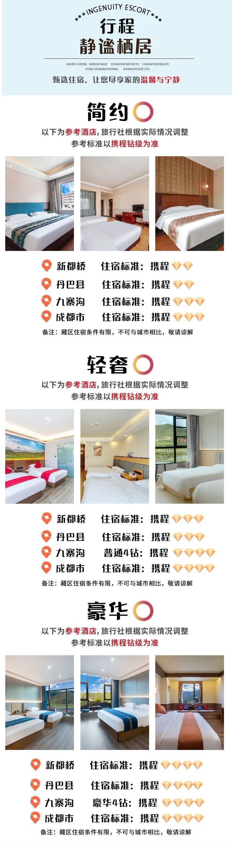 ● 赠2顿晚餐,1顿九寨酒店晚餐((九寨沟五钻及以上酒店不含酒店晚餐)+新都桥高原1顿汤锅