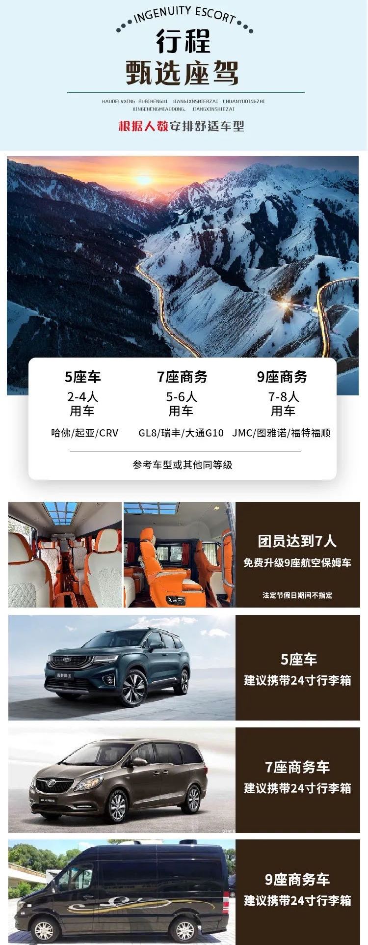 ■ 用车: 5座--9座车,全程根据人数安排车辆,不指定车型;保证一人一座(本产品在实际游览过程中可能会有不同车辆和服务人员为您服务,敬请谅解)