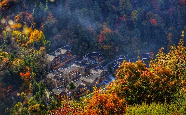 整齐划一的石楼掩映在彩林之中,木质门窗,雕花细作,门前菜地绿油油闪亮亮发着耀眼的光彩。