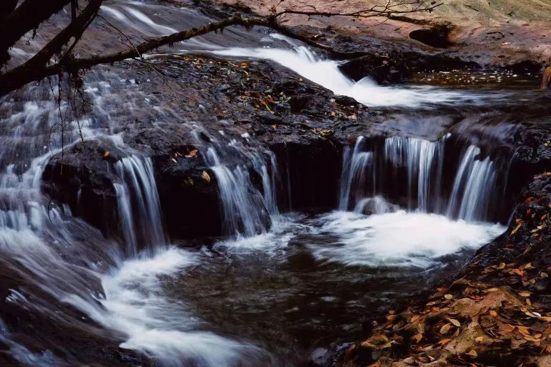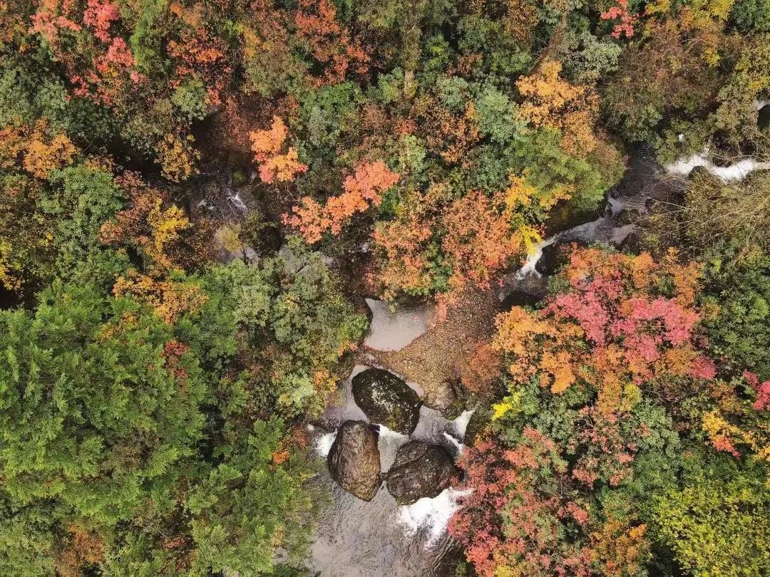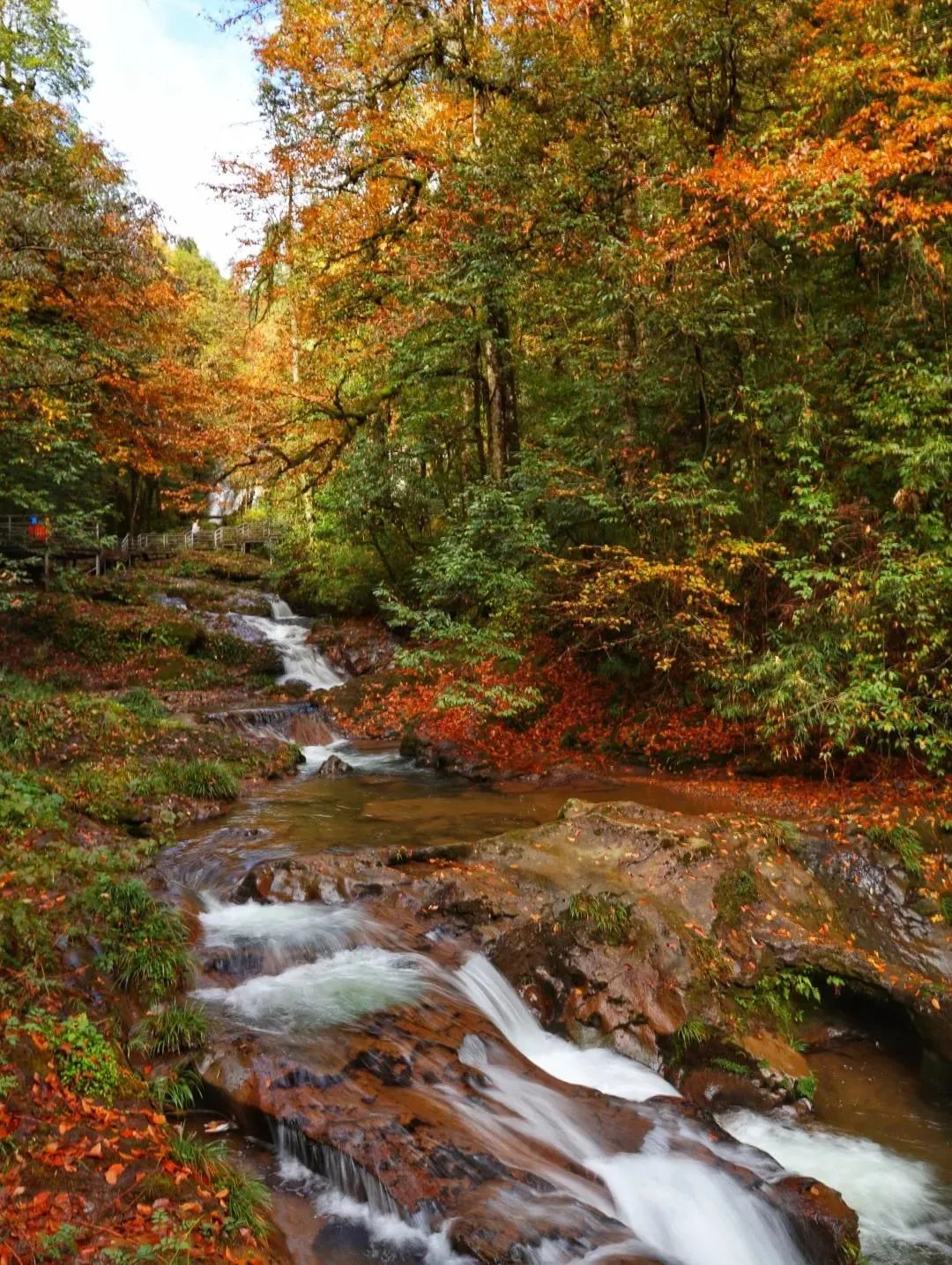 天生桥景区内溪瀑纵横,栈道延伸建于溪流之上,山里的彩林像一条彩色长廊一样,带着它独特的韵味秀出片片红叶,增添朗朗斑斓。