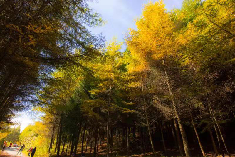 ▶ 之后在领队的带领下热身后整装出发。顺着蜿蜒的山路 穿越松林,漫步在金色的地毯上,可以感受到松针雨 漫山遍野的彩林,宛若油画的世界;经过2个小时左右到达徒步终点;然后选择地合适地方午餐(自带路餐)。