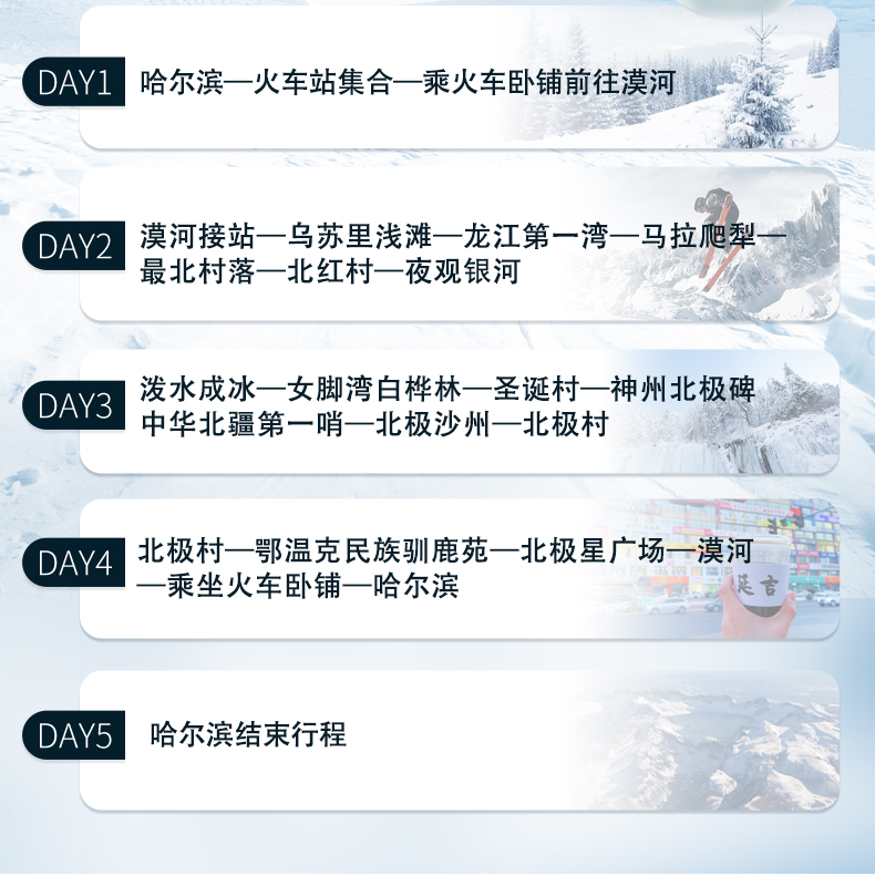 第5天哈尔滨散团,返程建议预订15:30后航班或14:00后的火车。