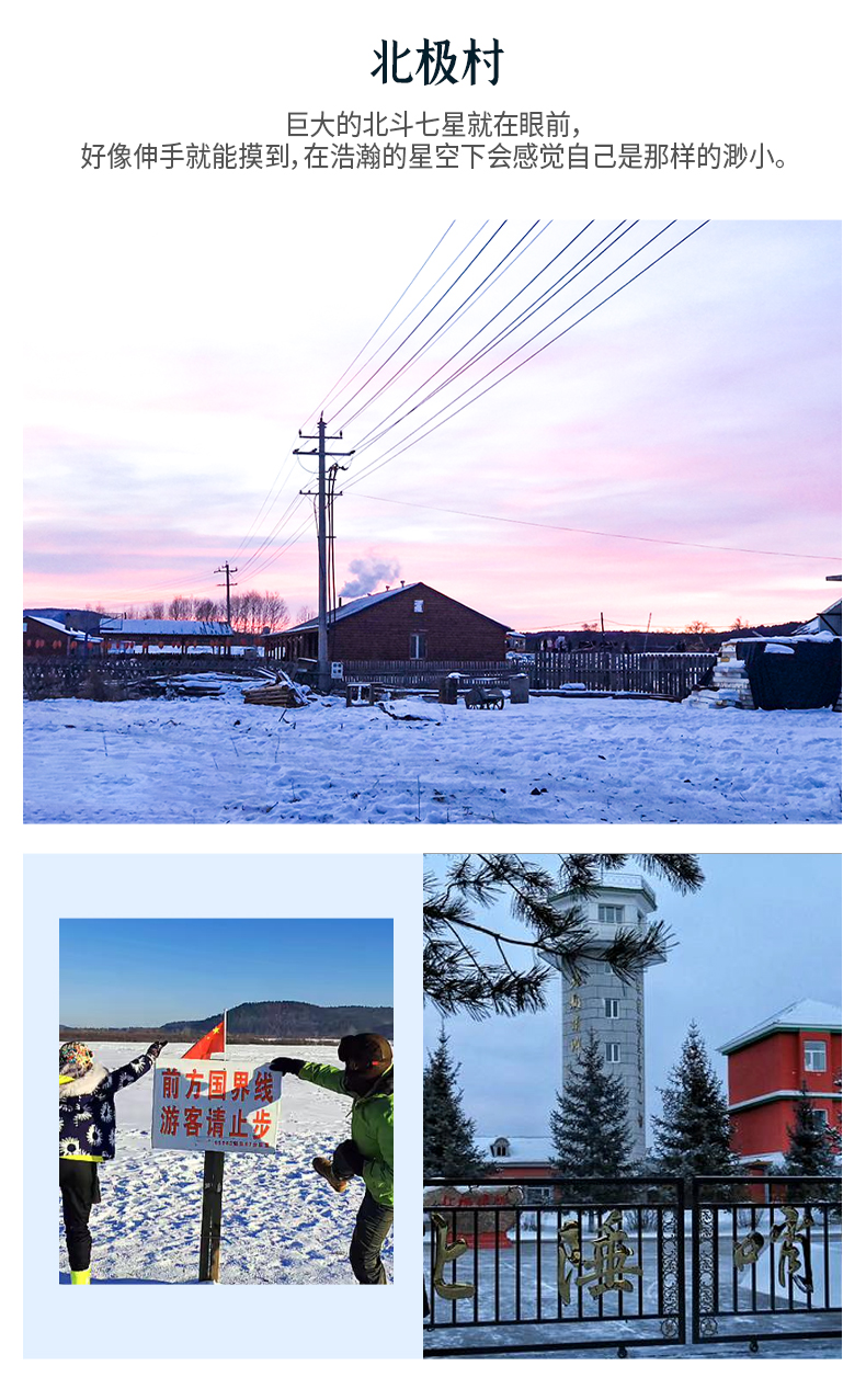 四、全程门票费:(北极村门票、圣诞村门票、龙江第一湾+乌苏里浅滩+环保车)