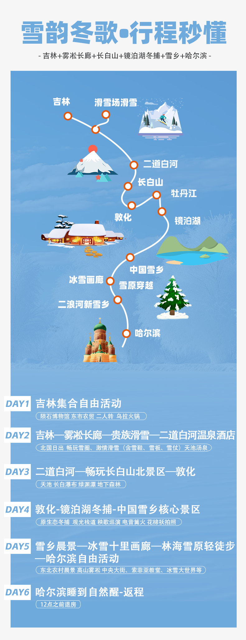 第5天哈尔滨散团,返程建议预订15:30后航班或14:00后的火车。