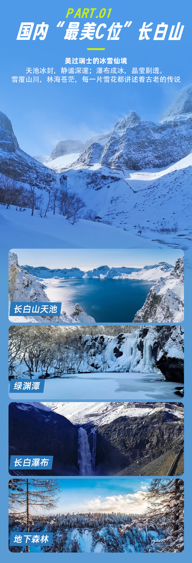 08:30进入景区后乘坐景区环保车深入景区,景区开发的非常成熟,在领队的带领下一一浏览,这里拥有中国乃至世界都不多见的【垂直自然景观带】,从柔美的岳桦林到附在岩石上的苔原带,再到不生一物的岩石带…..神奇景观到达山顶并未结束,队友们终于见到了朝思暮想的【白头山天池】,也终于知道选在冬季带您来长白山的原因:远处一望无际的原始林海雪原,近处谜一样的天池风光(没人知道天池的水来自哪里),还有接下来的地下森林等壮阔雪景,只有在冬季,您才能真正理解什么是幕天席地的豪爽壮阔。