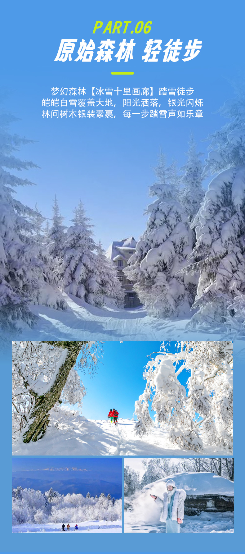 【林海雪原轻徒步】,这里的雪量及其丰沛,年平均降雪量在2米以上,独特气候形成了“千枝琼玉”、“万树花”的雾淞奇景。林中洁白如银,犹如龙宫洞府,别有一番情调。路旁结满了晶莹洁白的树挂,这些树挂仿佛经过了能工巧匠的精心雕刻,在阳光的照射下璀璨夺目,金光迸射,千姿百态,把人们带入如诗如画的仙境。