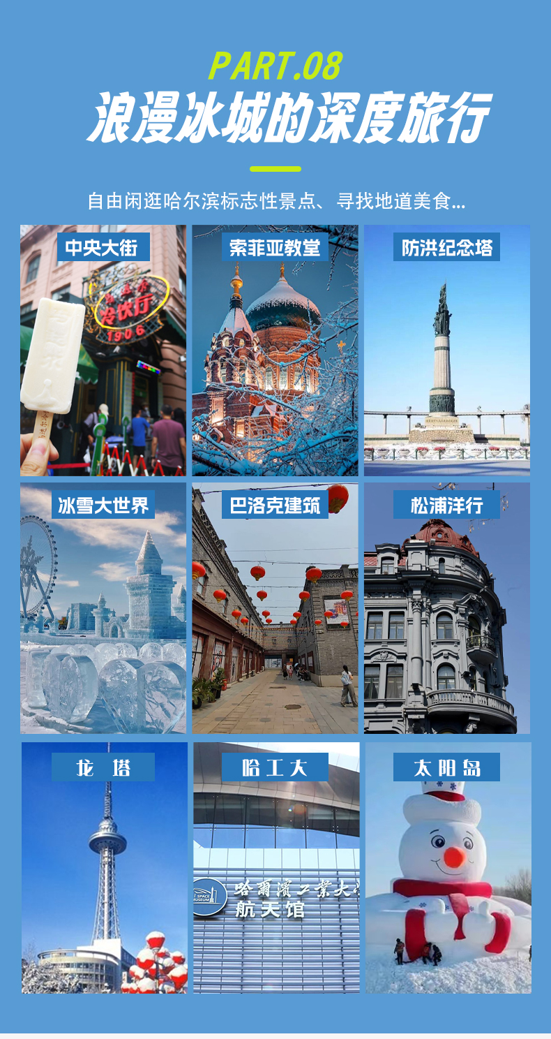 今天我们此次东北赏雪之旅到此就要结束了。今天可根据航班时间自由选择晚起或是约同伴继续逛街,或前往【红专街早市】感受东北的烟火气;亦或是老道外的【中华巴洛克街区】,哈尔滨的历史都被囊括在这片街区中。酒香不怕巷子深,道外隐匿了太多百年美食老店。【太阳岛雪博会】欣赏精美的雪雕作品,感受冰雪艺术的魅力。【极地馆】观看极地动物的精彩表演,感受它们的智慧和魅力。