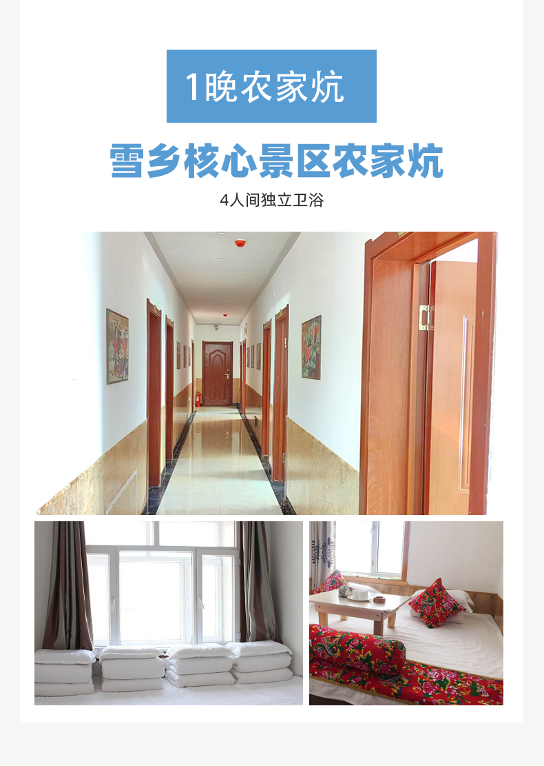 1、单人报名全程默认拼房,不收取单房差,如想单住需补单房差及雪乡农家炕差价