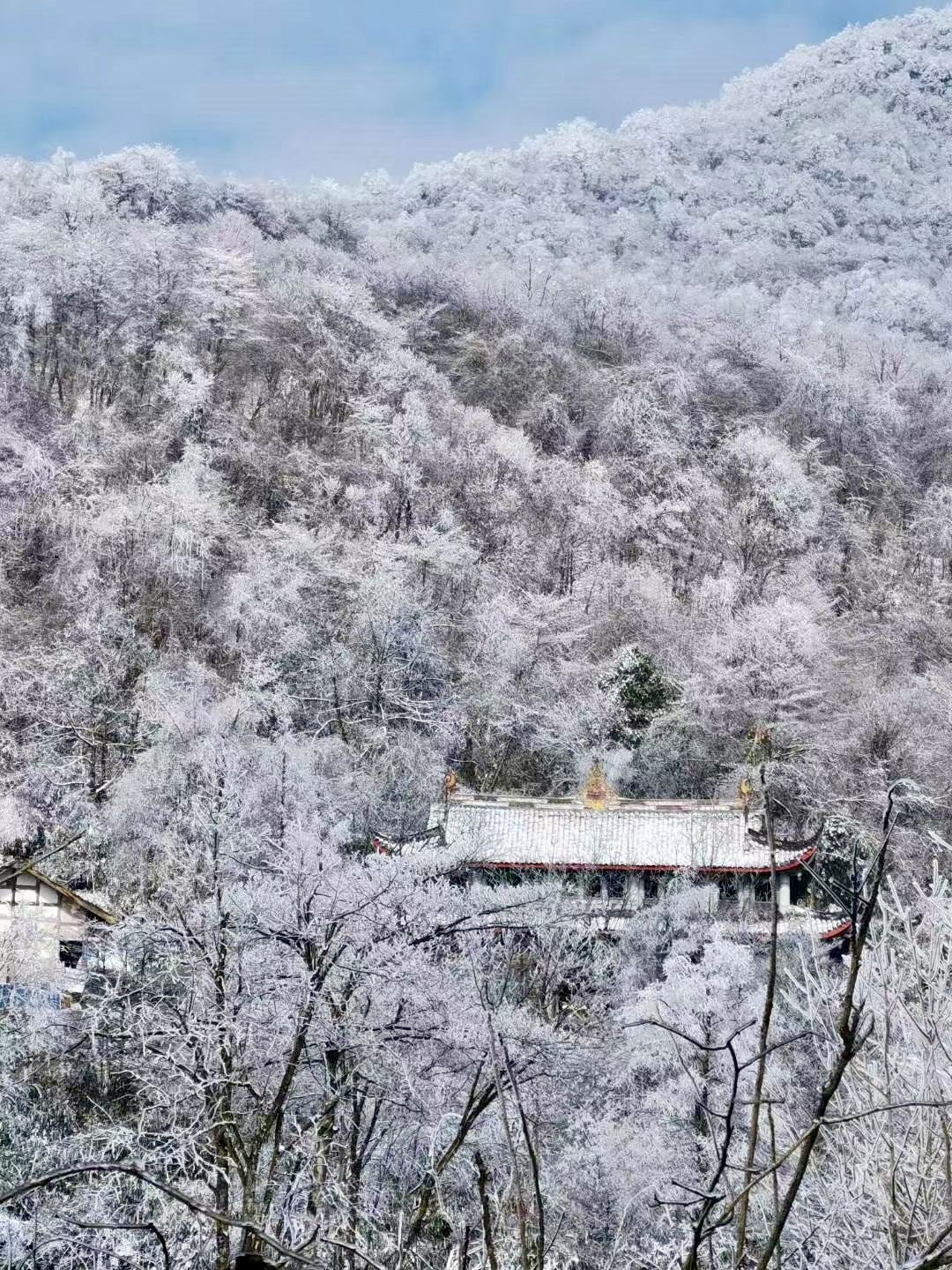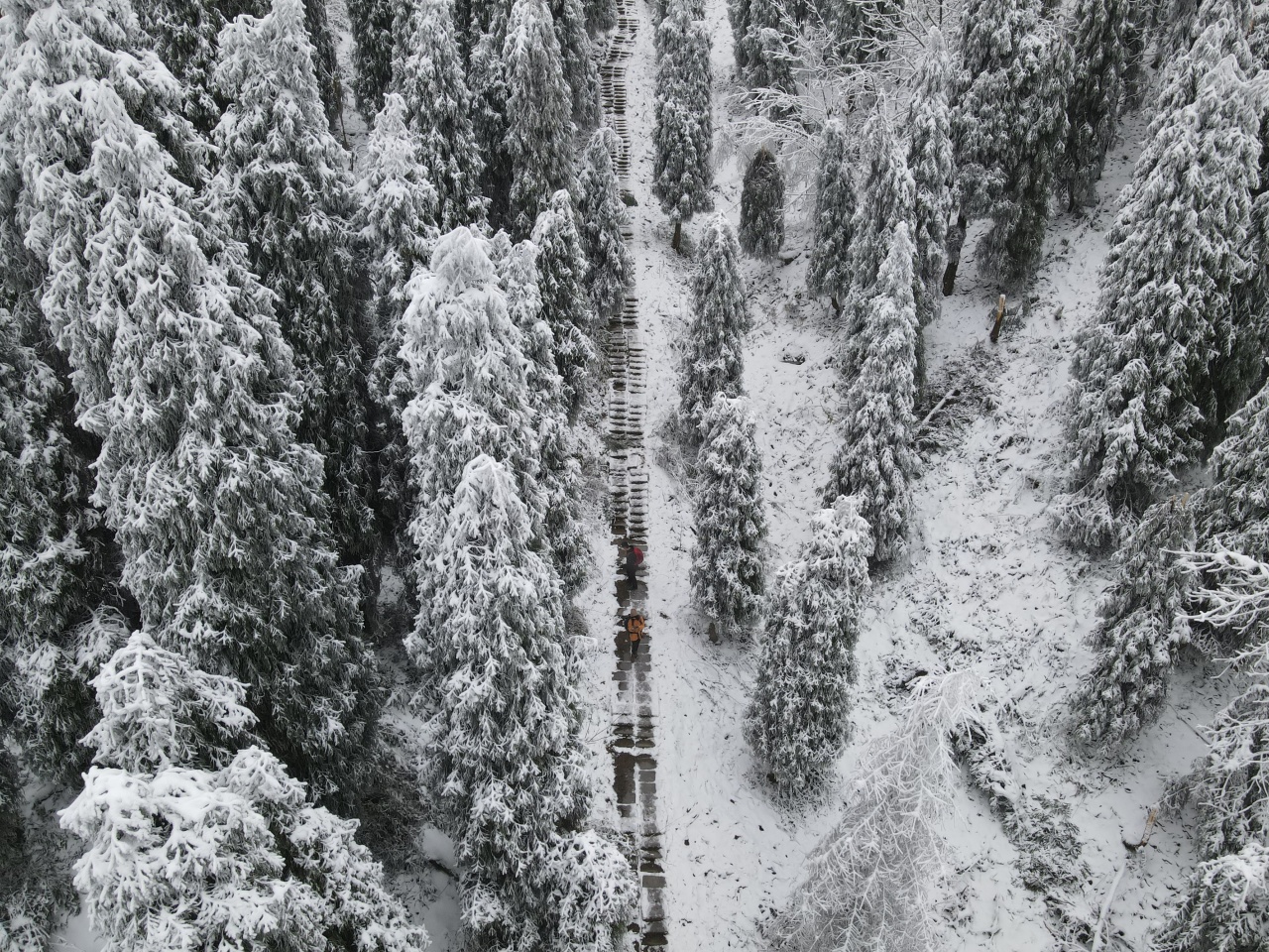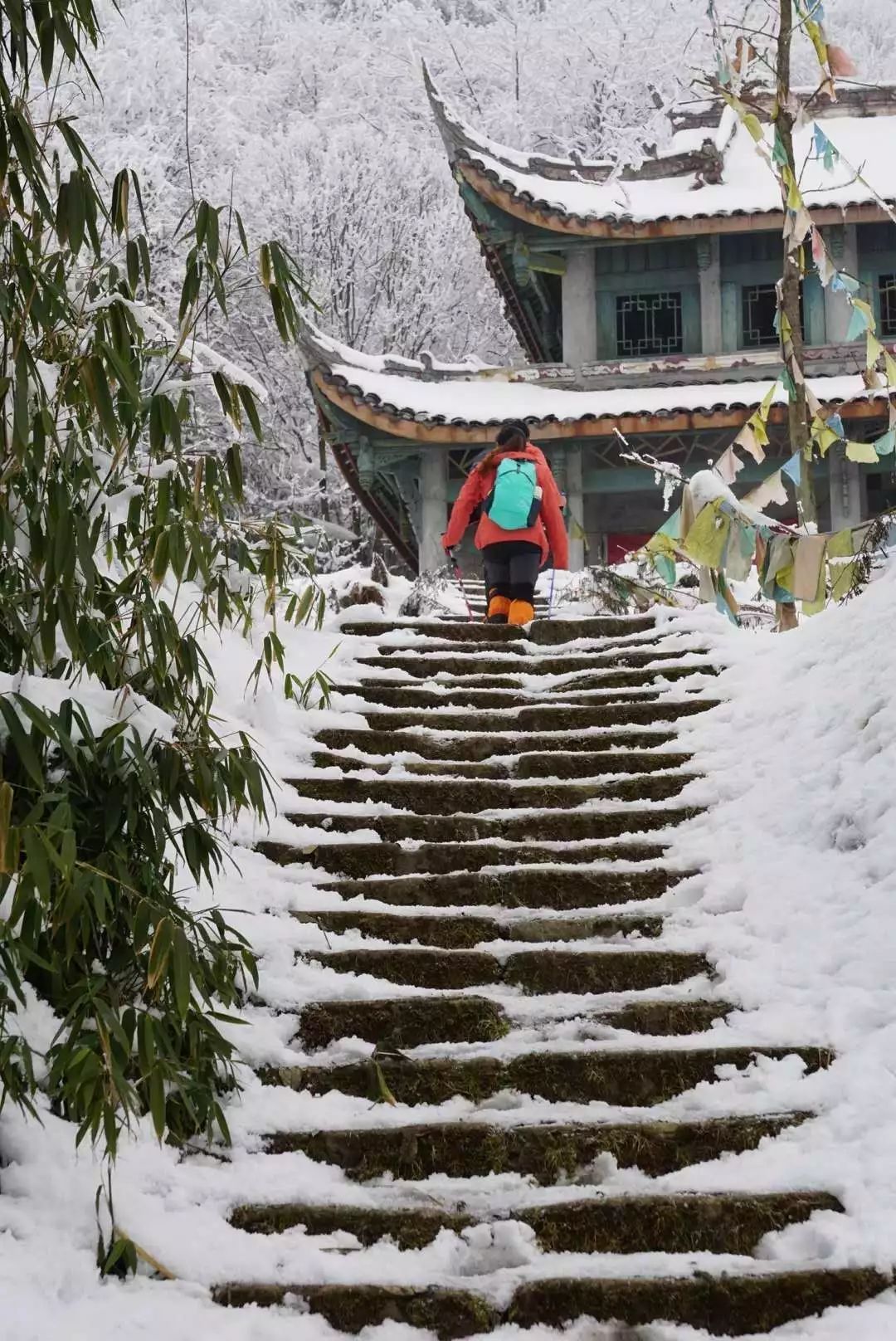 天气晴朗时,可以清晰地看见对面的九峰山。这里森林茂密、山势徒峻,冬天积雪最深可齐腰,是成都周边不可多得的冷门玩雪胜地。