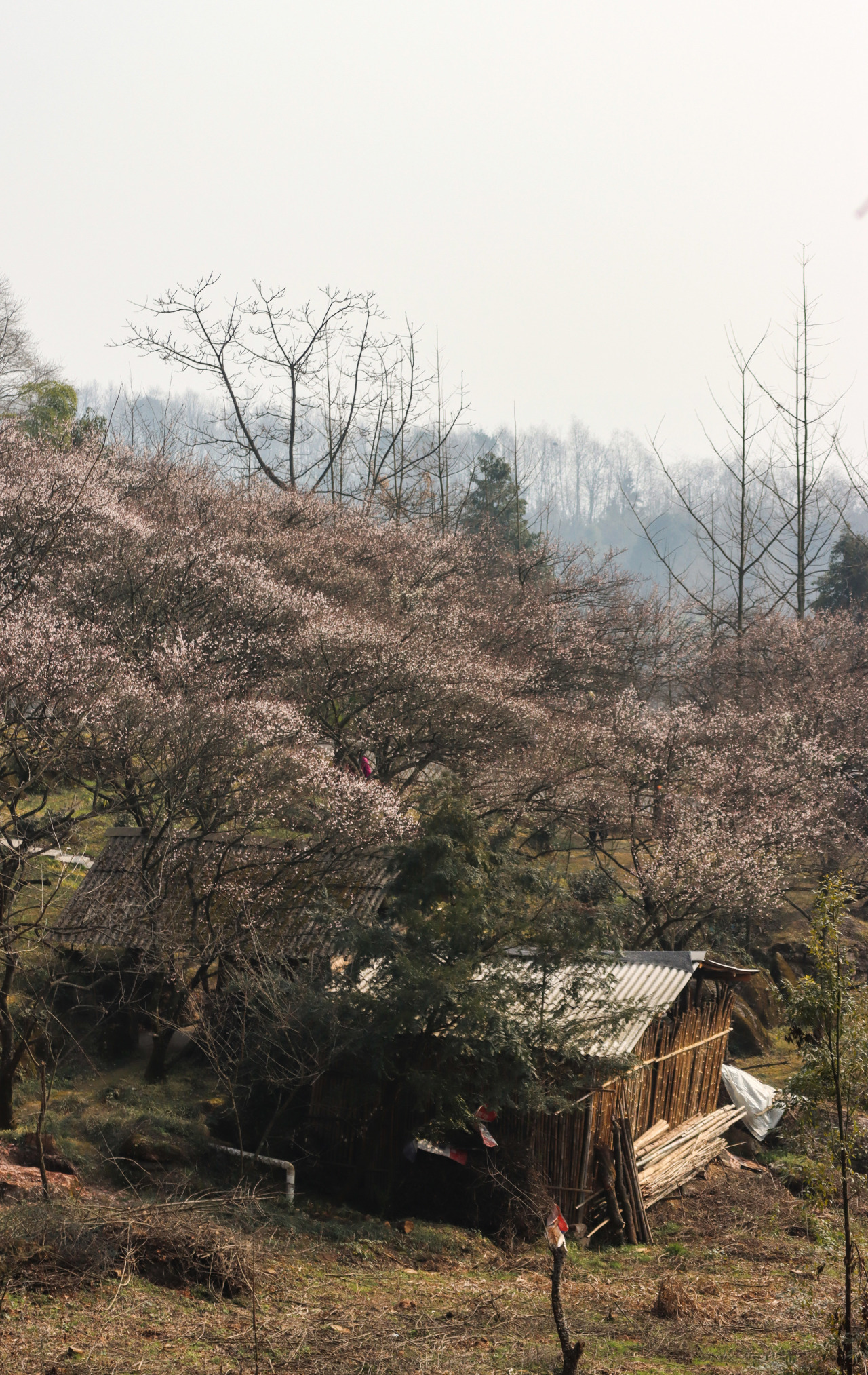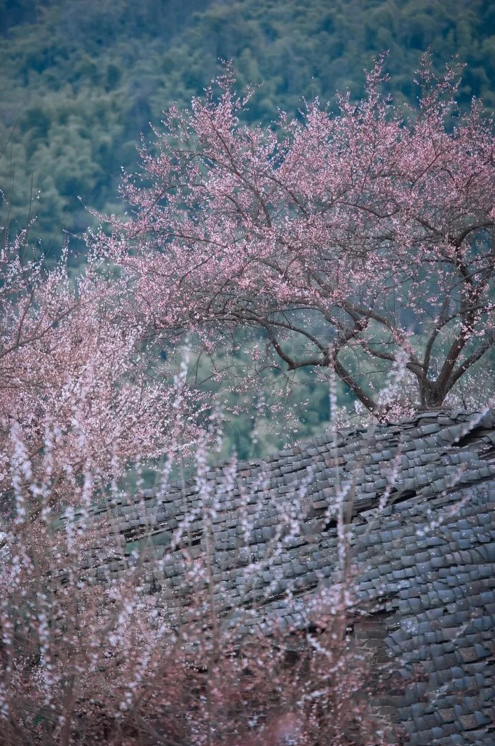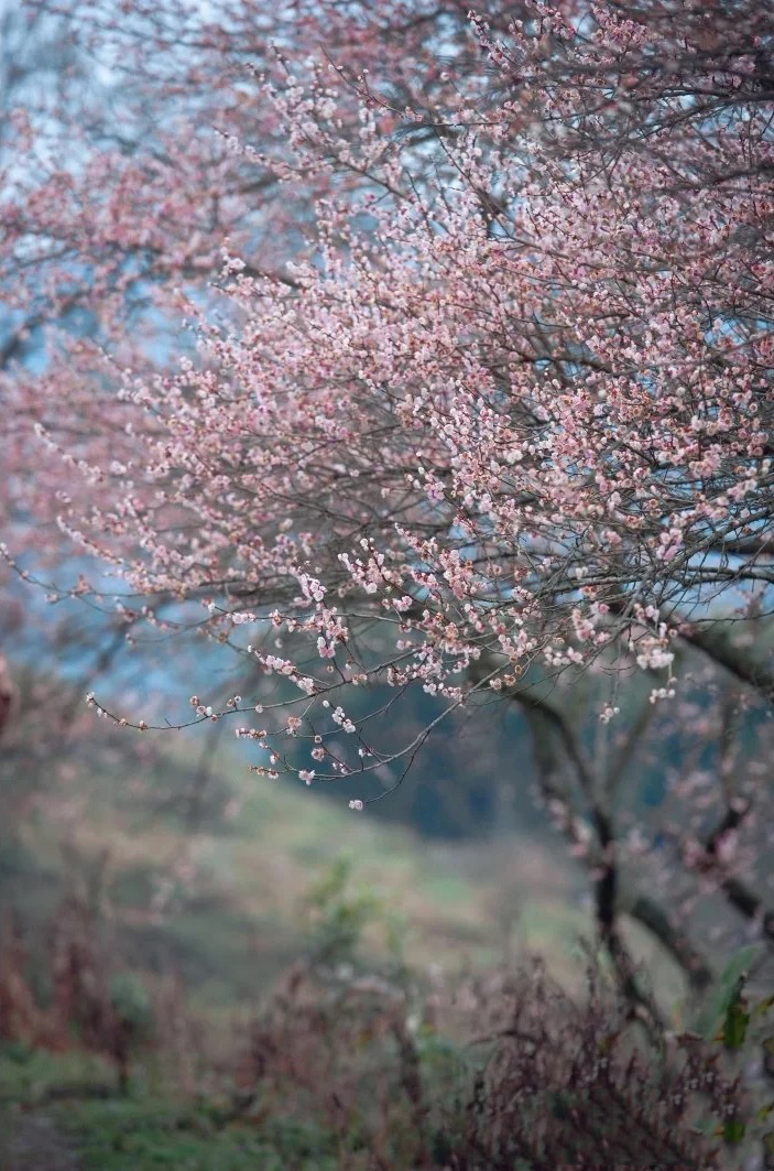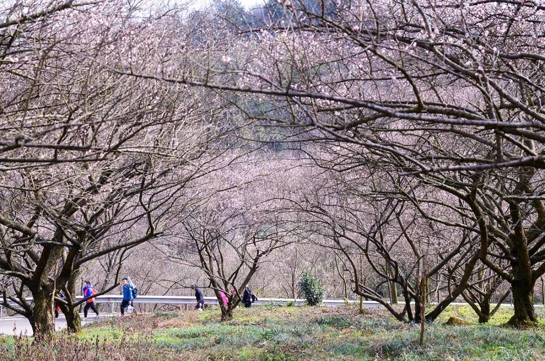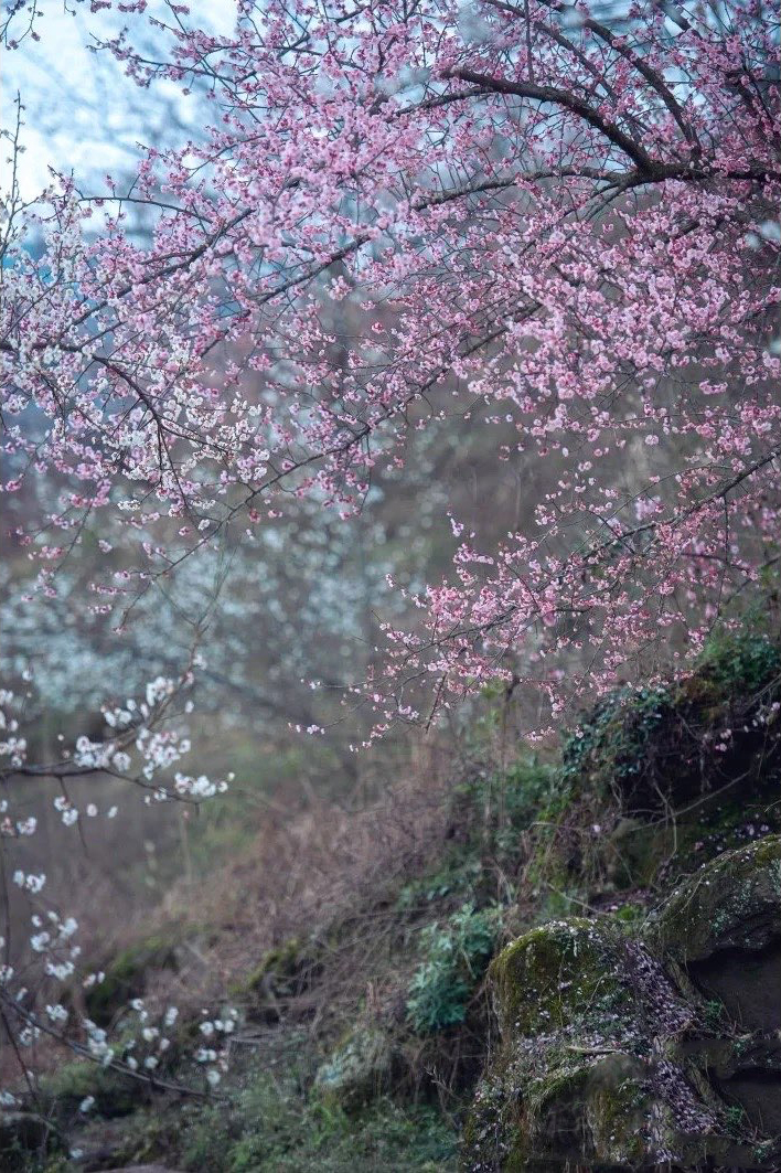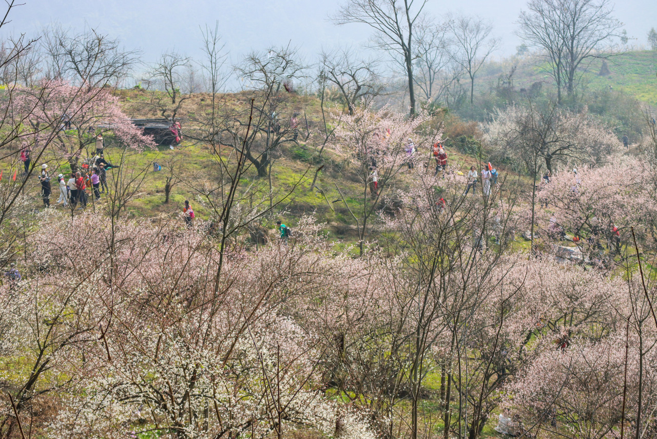 2月初鹤鸣山的乌梅花从山腰到山顶依次绽放。每年2月中旬到4月中旬,乌梅花(2月)、李子花(3月)、梨花(4月)会陆续开放。