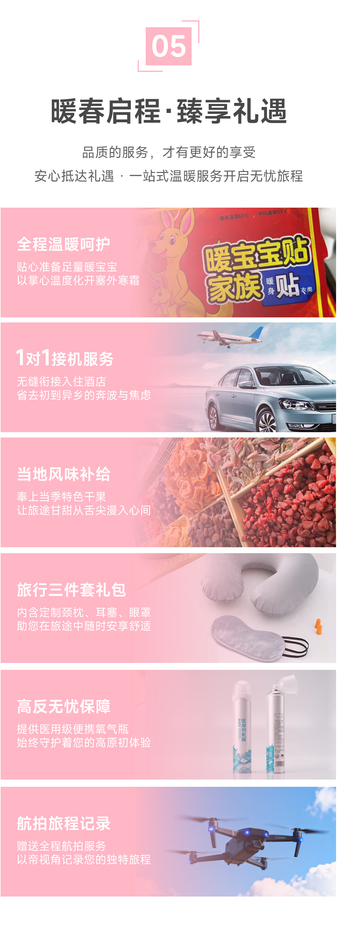1.随车赠送车上饮用水,特色应季水果(或者新疆干果)+氧气瓶;