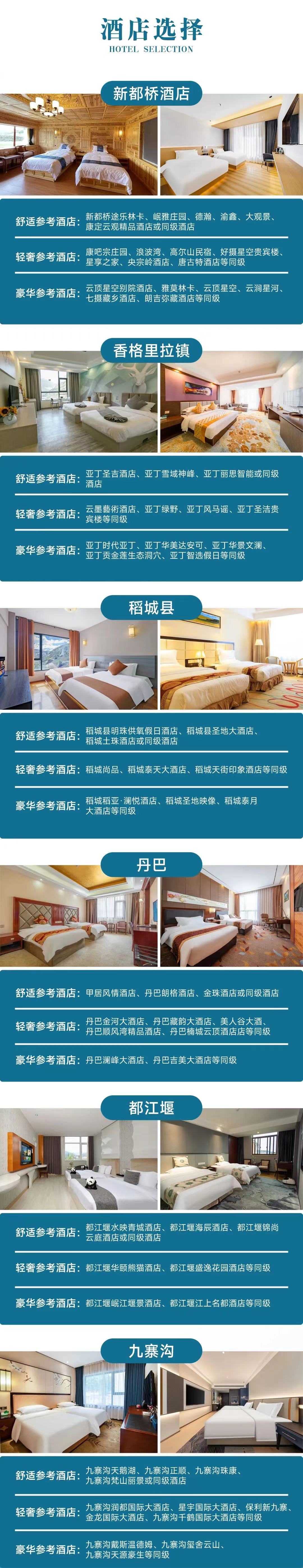 九寨沟:润都国际温泉、九宫宾馆、新九寨沟宾馆、星宇国际大酒店、保利新九寨、金龙国际大酒店、九寨沟千鹤国际大酒店等同级酒店