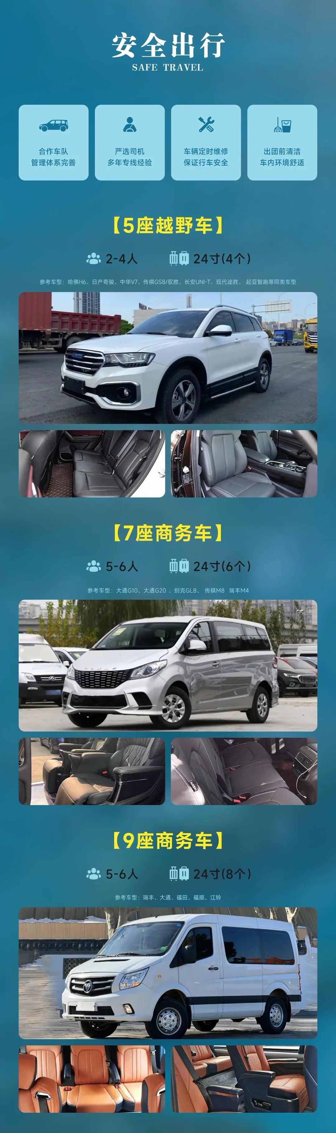 ● 5座SUV越野/7-9座商务车,全程根据人数安排车辆,不指定车型