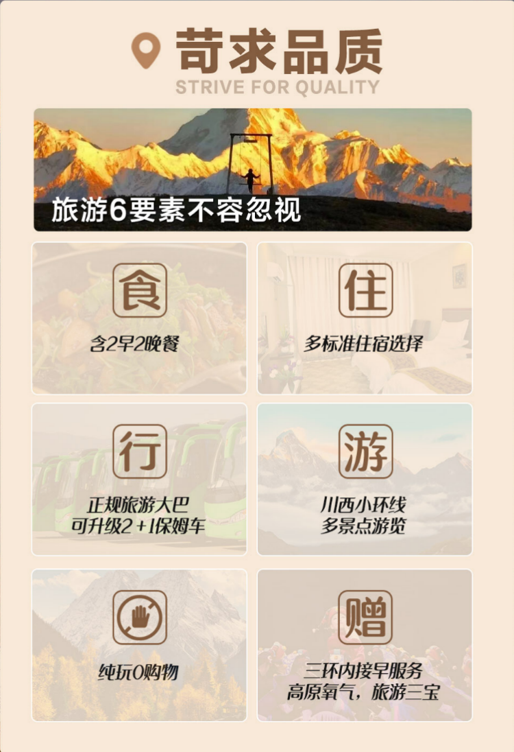 4、本次行程前往高原地区,请务必根据自身的身体情况选择该行程。沿途车辆较多,有可能会堵车,交通管制等,导致用餐时间较晚或回成都的时间较晚,敬请理解。