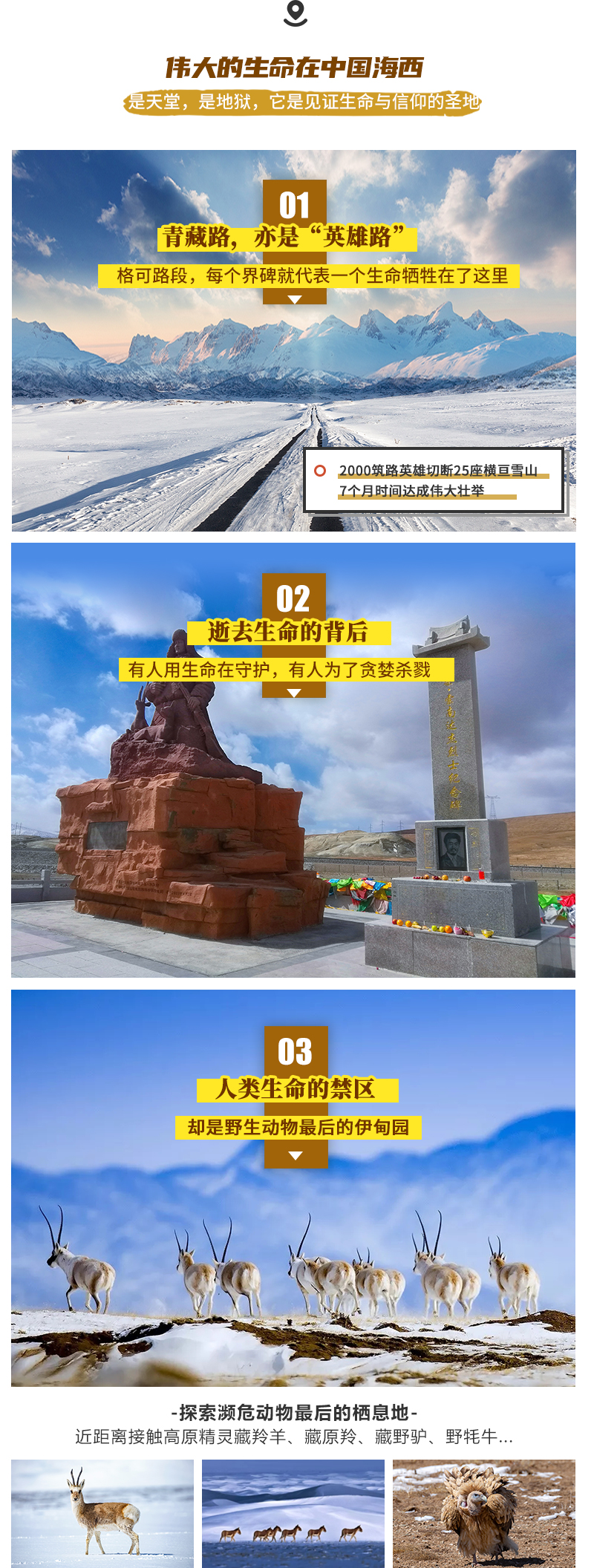 沿途可以看到各种野生动物,藏原羊、藏野驴、藏野狐,幸运的话也可以遇到极少见到的藏羚羊!在昆仑山口,我们可以看到可可西里藏羚羊雕塑,还可以凭吊索南达杰纪念碑,美丽而荒凉的青藏高原,绵延起伏的山岭,成群的藏羚羊和野驴,还有途中那些沿着天路磕长头的信徒,都能让你身心浸没在藏地风情中。