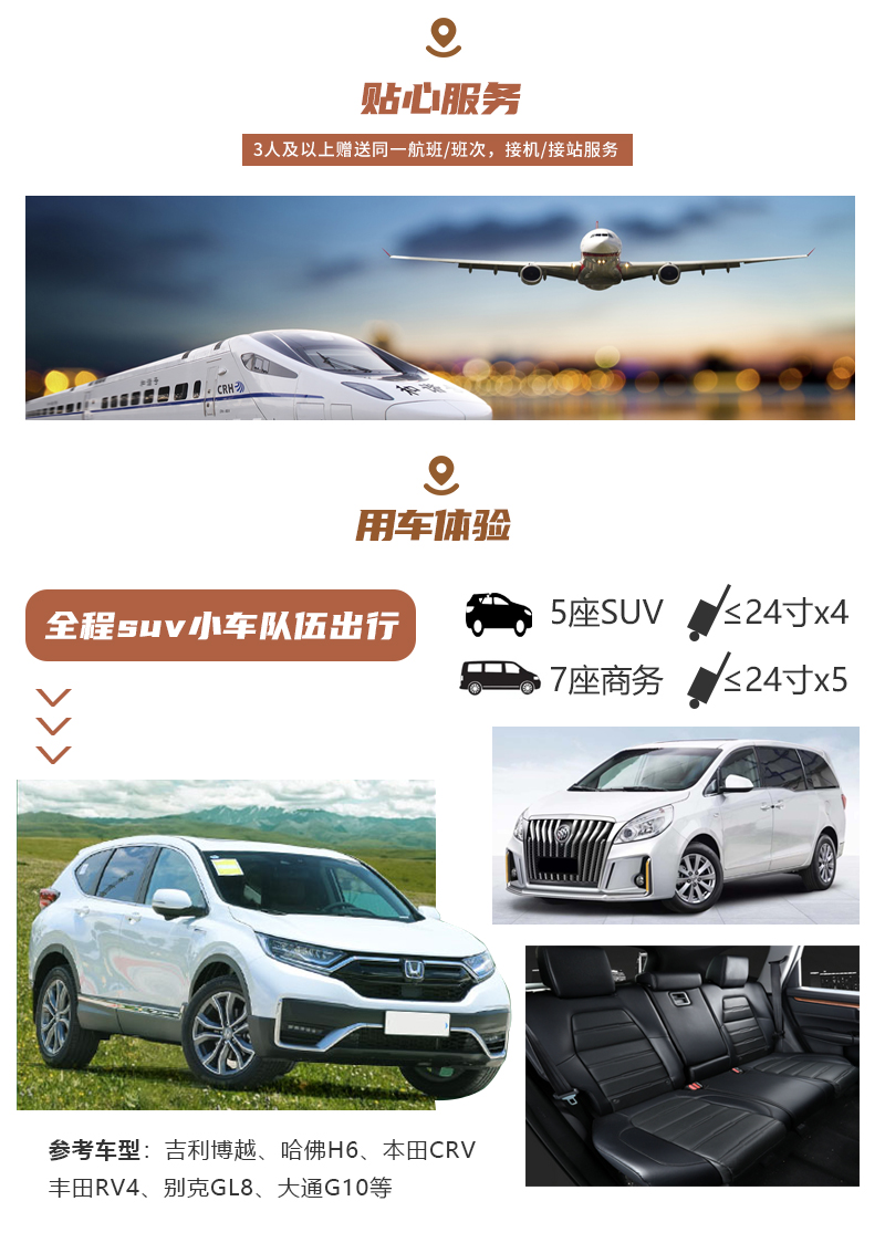 【交通】全程5座SUV或7座商务车费用;含司机吃住、过路费、油费;(5座SUV坐4人+1司机,7座商务坐5人+1司机),商务车不支持指定,根据最终人数安排。