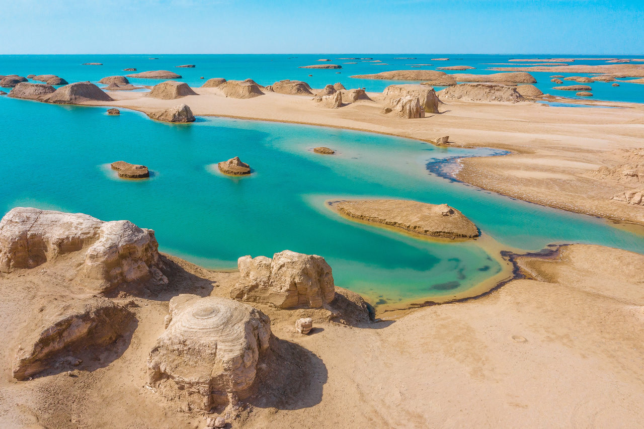 车子继续向前行进,来到至今鲜少有人涉足的【水上雅丹】。雅丹是一种风蚀地貌,意为陡峭的小山包。世界上绝大多数的雅丹地貌都分布在干旱的地域,水上雅丹世所罕见。远远望去,这里如同遗世独立的国度,就像神秘的楼兰古国,历经千年风沙终于被揭开面纱。