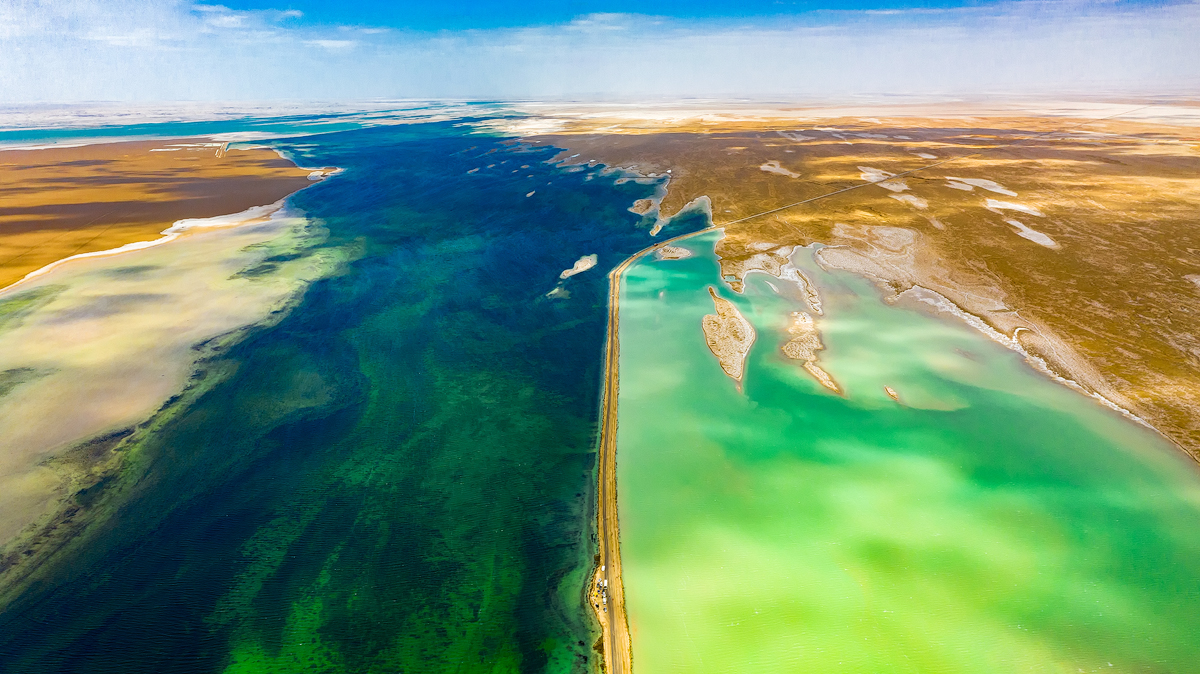 想必看过水上雅丹的你会赞叹大自然的鬼斧神工,那么接下来的景色会更加让你对大西北的美景流连忘返!【西台吉乃尔湖】,它的神奇之处在于一条公路把湖水分开成两种颜色不同的湖,一半是蓝色,一半是绿色。徜徉在如此魔幻的圣境之中,诗和远方止于脚下。