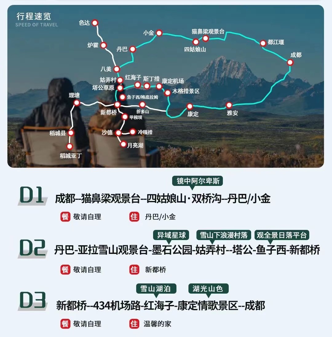 成都--猫鼻梁观景台--四姑娘山(双桥沟)--丹巴