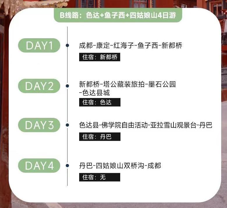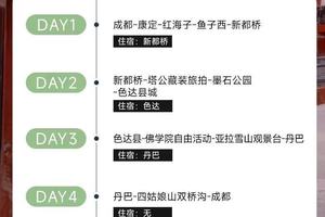 【门票】全程不含门票,需自行预订(建议下单后直接购买游玩景区的门票观光车索道等)如因未能提前购买导致不能正常游玩景区的,需自行承担;四姑娘山景区旺季限流,请务必提前预约购票,现场刷证入园;预定渠道:阿坝旅游网公众号。