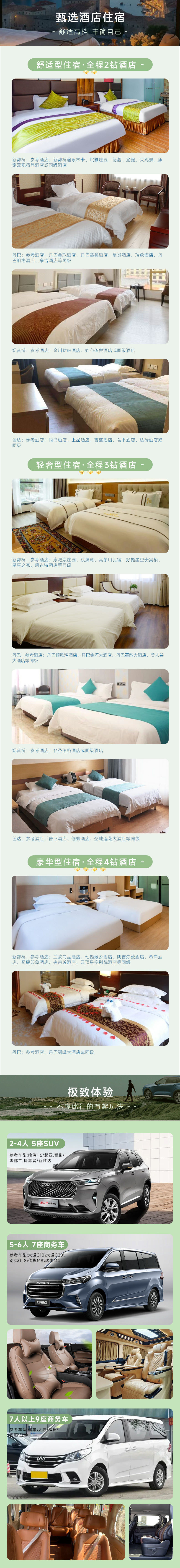 1、用车: 5座SUV越野/7-9座商务车,全程根据人数安排车辆,不指定车型(特别说明:车位一旦预定以后无法取消,若中途离团费用不退!);