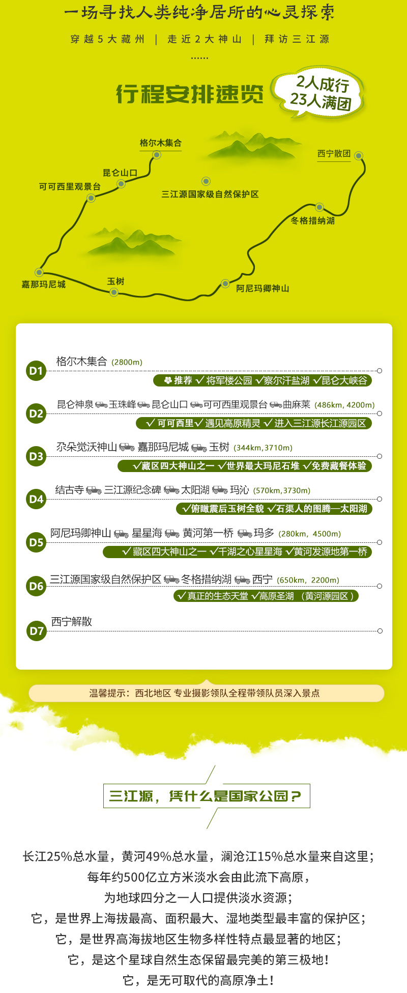 2.由于我们进入的是三江源国家公园黄河源,请小伙伴们务必保证绿色环保,带走自己所产生的一切生活垃圾,如有能力也请在游玩的同时捡走其他垃圾,为我们共同守护的三江源贡献一份力量;