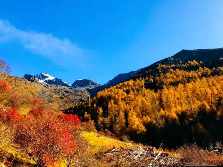 在这个还未被大部队扫荡过的秘境,雪山配红叶飒是好看!徒步起点3000左右、虞美措、最高海爬3580左右徒步往返约6公里,一起欣赏米亚罗彩林、 霸王山谷、雪山海子。