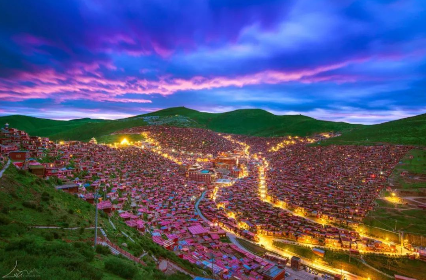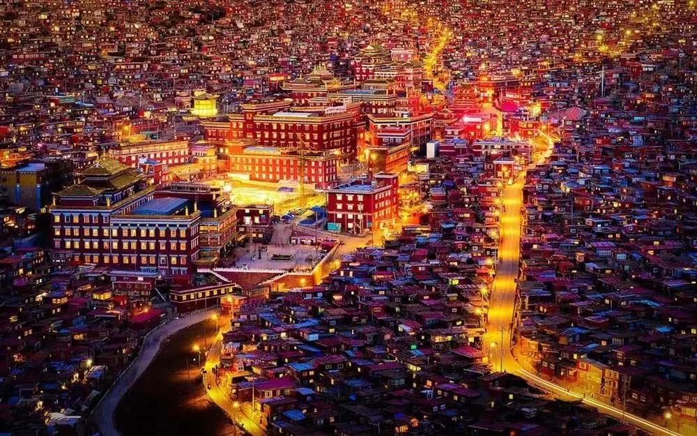 ▶ 游览完后前往喇荣沟【五明佛学院】,震撼的佛国画卷渐渐呈现在眼前-漫山遍野的红房子,裹着红袍的僧人在其间穿行,金碧辉煌的佛学院,蓝天白云下气势宏伟的坛城(海拔4000米);与信徒和僧人交流、转经、朝拜,体验僧人修行方式,在转经筒持续的旋转中,感受信仰的强大、内心的宁静。我们一直玩到晚上20:30点看了色达夜景,坐学院公交车返回佛学院大门处,乘大巴返回酒店休息。