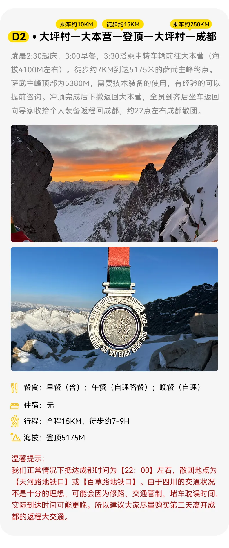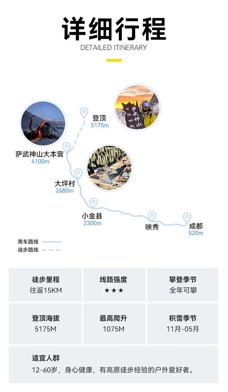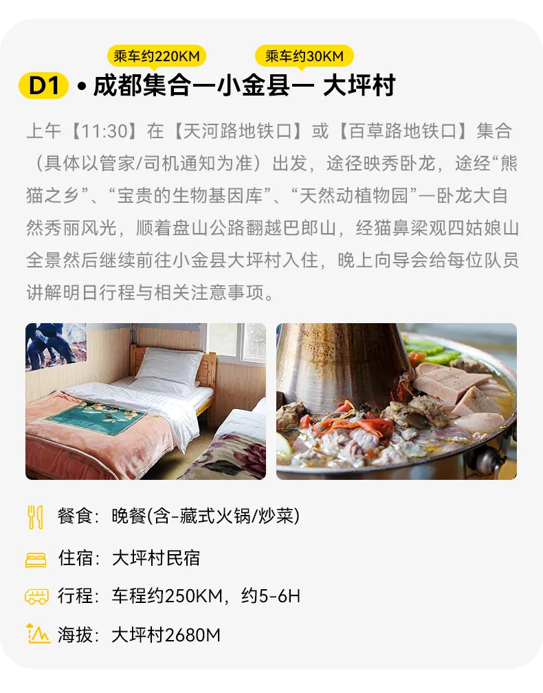 1.交通:成都出发根据人数选择合适车型,一人一座,大坪村-萨武神山大本营中转车。