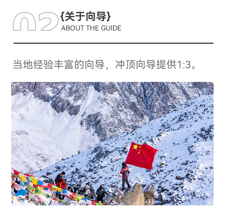 4.专业登山向导带队,10人以上配专业高山领队全程跟队。