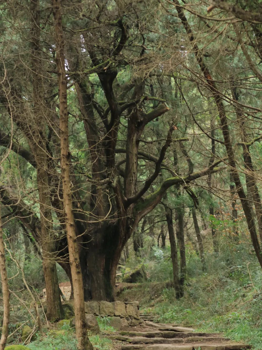 望夫柏:一株古柏倾斜向古道,宛如妇人远眺,民间传为妻子盼丈夫归乡所化;