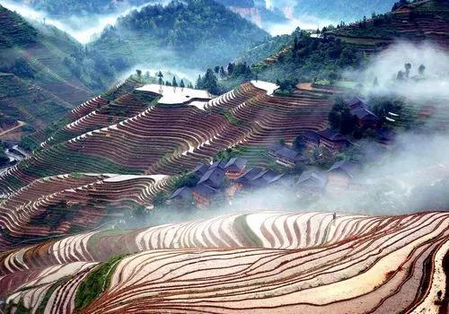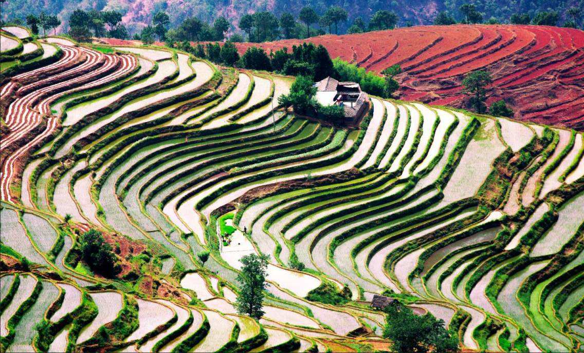 ▶ 餐后前往【新山梯田】,几代傈僳族人经过努力,他们把周围的山谷用石块砌起田坎开垦梯田,引来龙肘山水灌溉,并在梯田中种植稻谷、玉米、土豆、烤烟。蓄水时节,异常美丽。新山梯田依山沿坡修建,沿着陡峭的山坡层层向上分布,层层叠叠的梯田依附于龙头山、龙肘山下,非常壮观美丽。