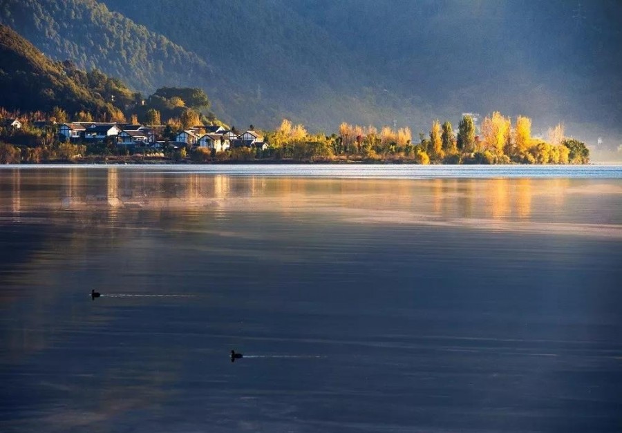 冬季的邛海天净水明,红枫翠柏,倒映湖面。起风时,海浪奔涌,似白鹅嫱戏于波涛上。