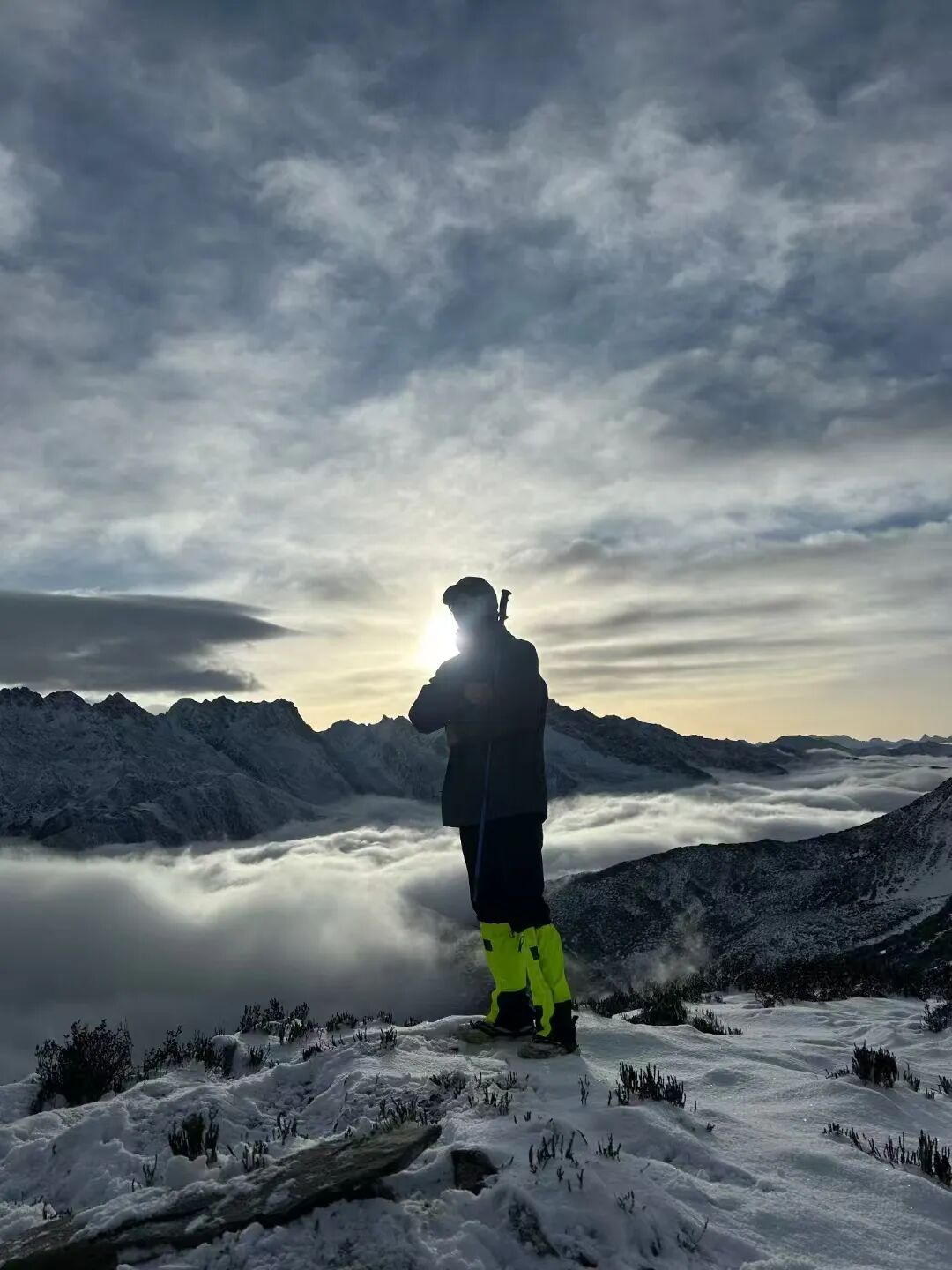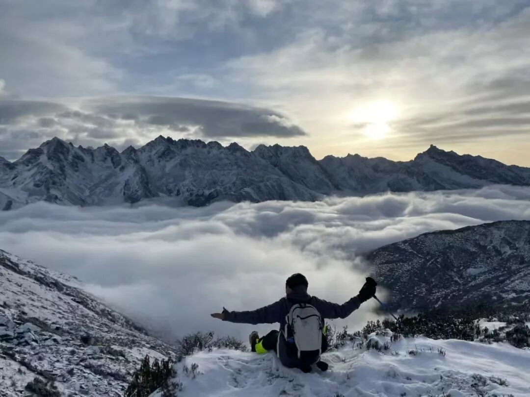 晨曦将白雪照成暖黄色,顶峰眺望,山间烟波缭绕,云卷云舒。攀登的艰辛疲惫瞬间飘散。