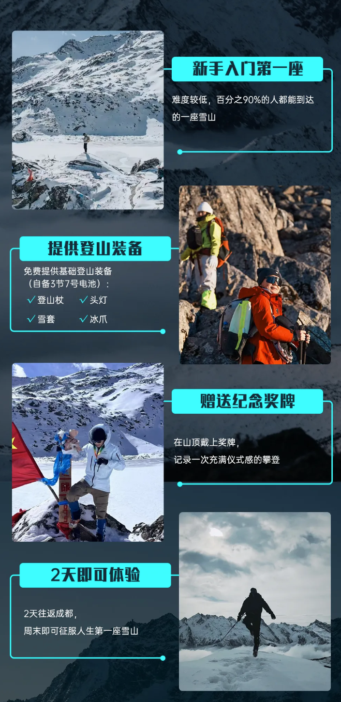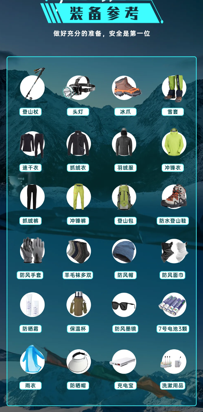 提供装备使用:冰爪+雪套+登山杖+头灯(需自备3节7号电池)。
