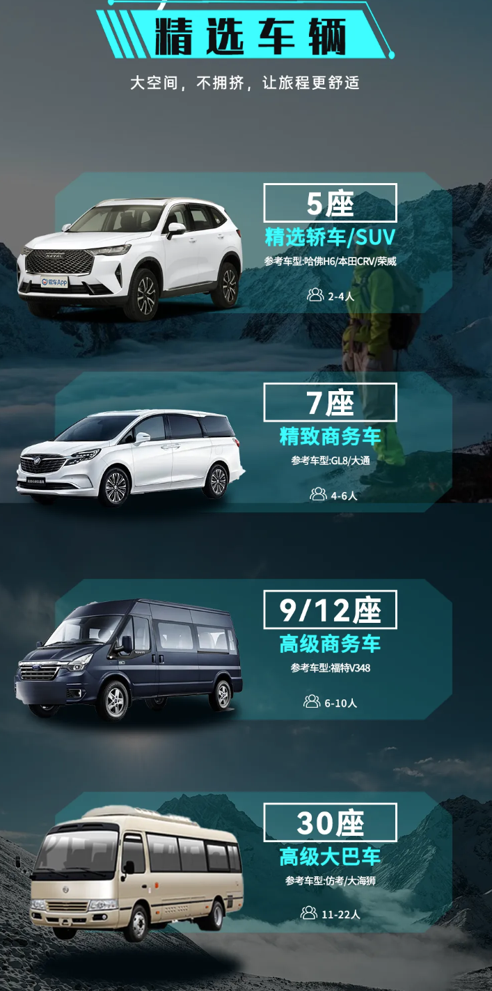 交通:当地全程交通费用,根据人数选择合适车型拼车往返。