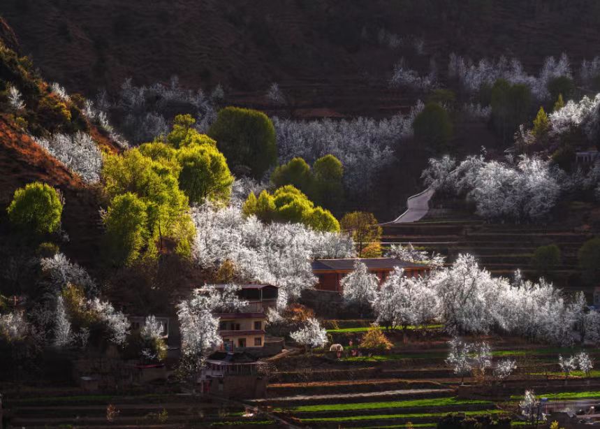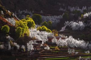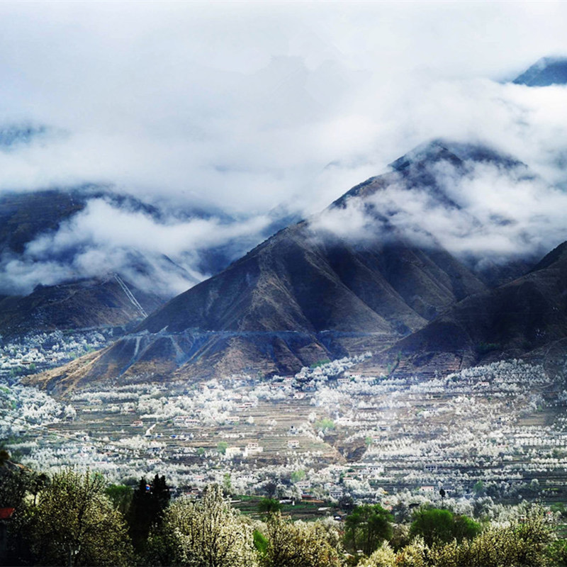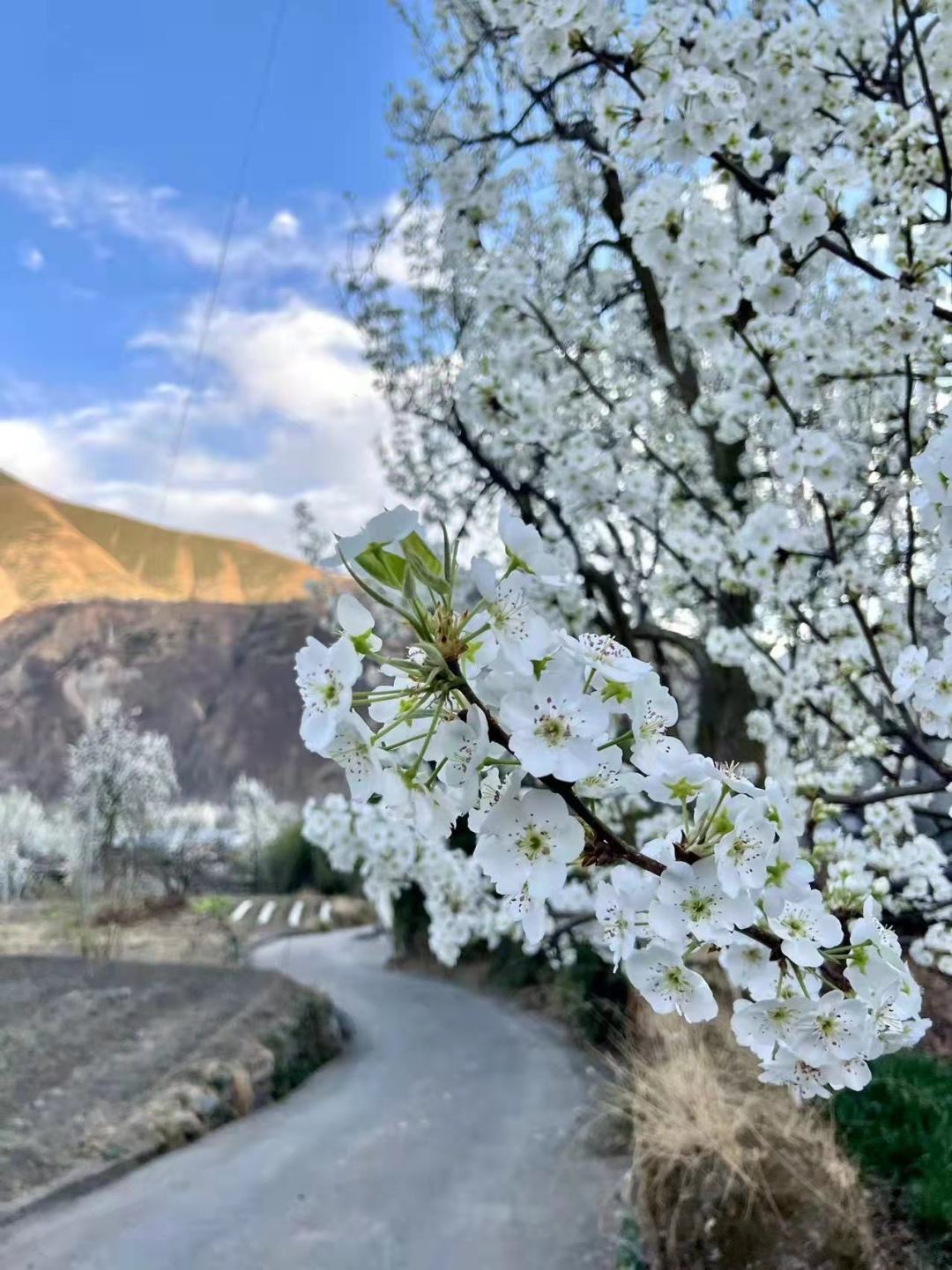 金川最好的时节,万物复苏的初春三月,正值金川成千上万棵梨树花期,雪白色的梨花竞相开放,一片片、一层层的铺散开来。
