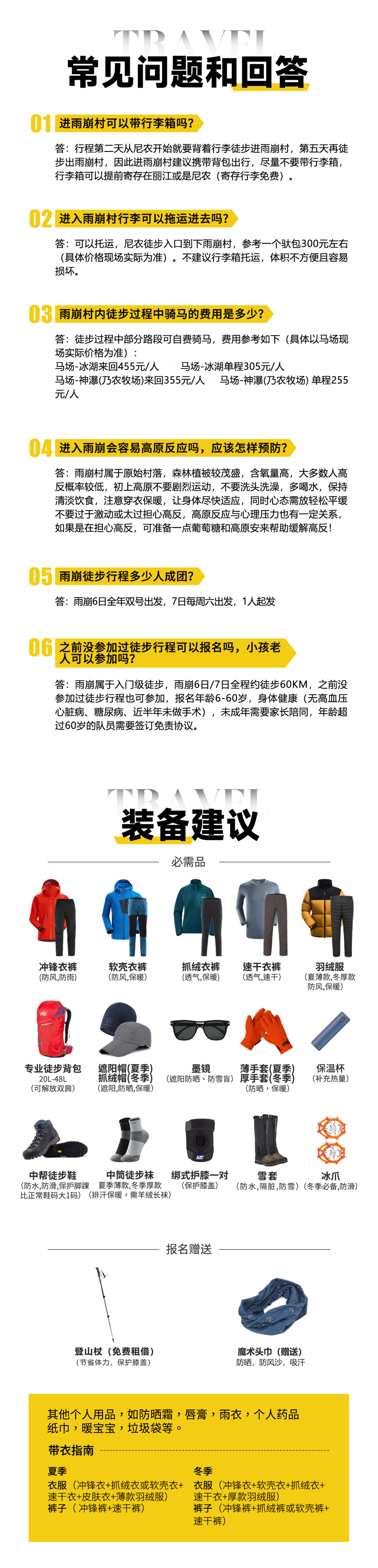 装备:登山杖1根(免费租借)、一次性雨衣1件(仅雨季提供)、魔术头巾1条;