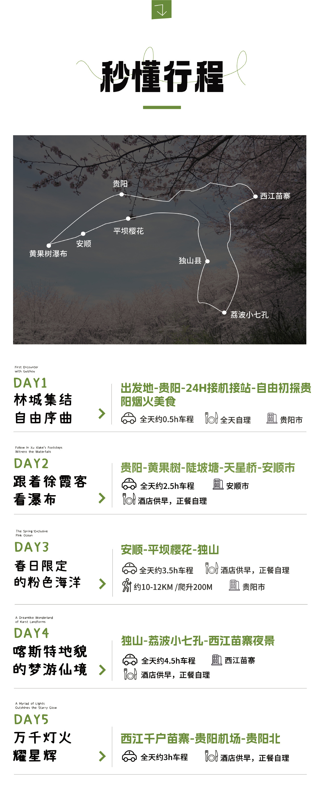 ① 按往年的花期经验,平坝樱花最旺花期均在3.18-3.28之间,但花期会受天气以及气温等因素影响而有变动,敬请大家谅解;如樱花未开或效果不好,刚会更换成青岩古镇以及独山天洞两个景点,增加的门票费用自行承担
